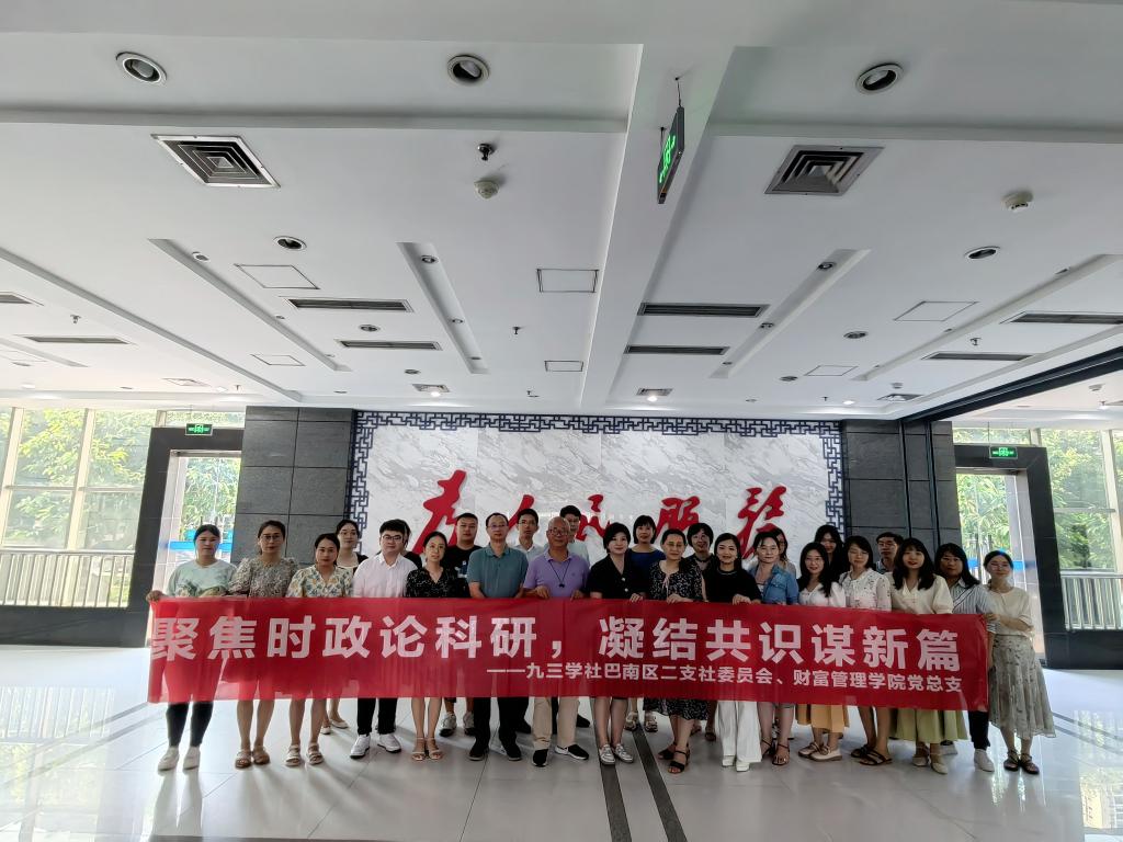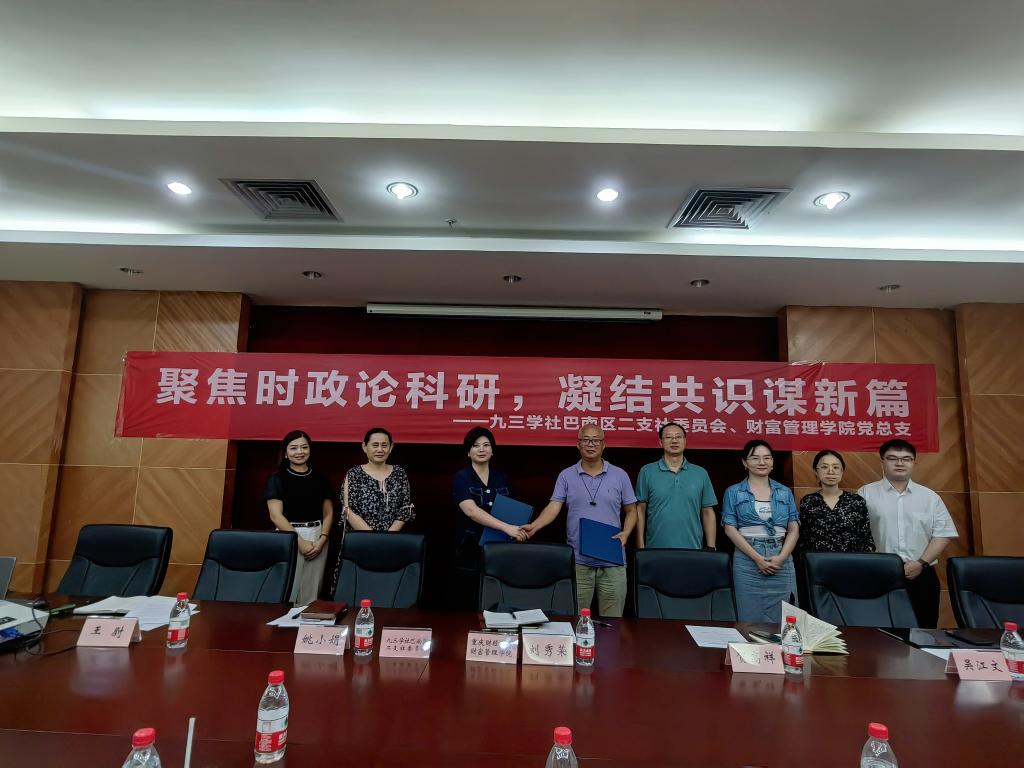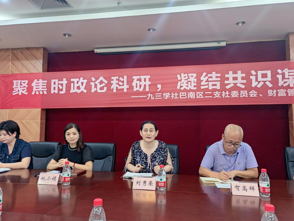 7月8日下午,财富管理学院党总支联合九三学社巴南区二支社,在巴南区人民政府218会议室组织召开了以“聚焦时政论科研,凝结共识谋新篇”为主题的联合组织生活会暨合作交流座谈会。财富管理学院党总支书记兼院长贺高祥、九三学社巴南二支社委员会主委刘秀荣,副主委姚小娟、吴江文,九三学社巴南区二支社主委王尉以及财富管理学院全体教师党员、九三学社巴南二支社部分社员参加了本次会议。