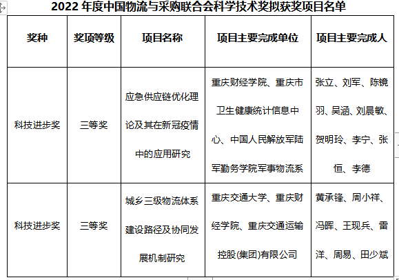 近日,中国物流与采购联合会公布了2022年度中国物流与采购联合会科学技术奖获奖名单,我校张立教授牵头申报的《应急供应链优化理论及其在新冠疫情中的应用研究》获得科技进步奖三等奖,冯晖老师参与重庆交通大学黄承锋教授团队申报的《城乡三级物流体系建设路径及协同发展机制研究》也获得科技进步奖三等奖。