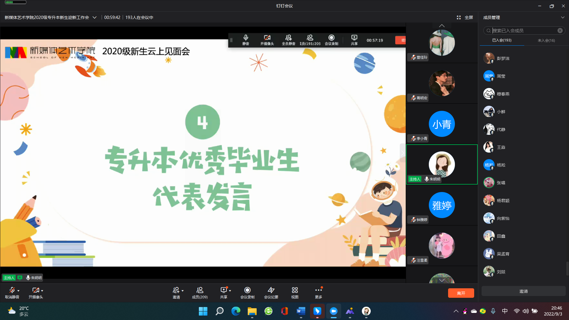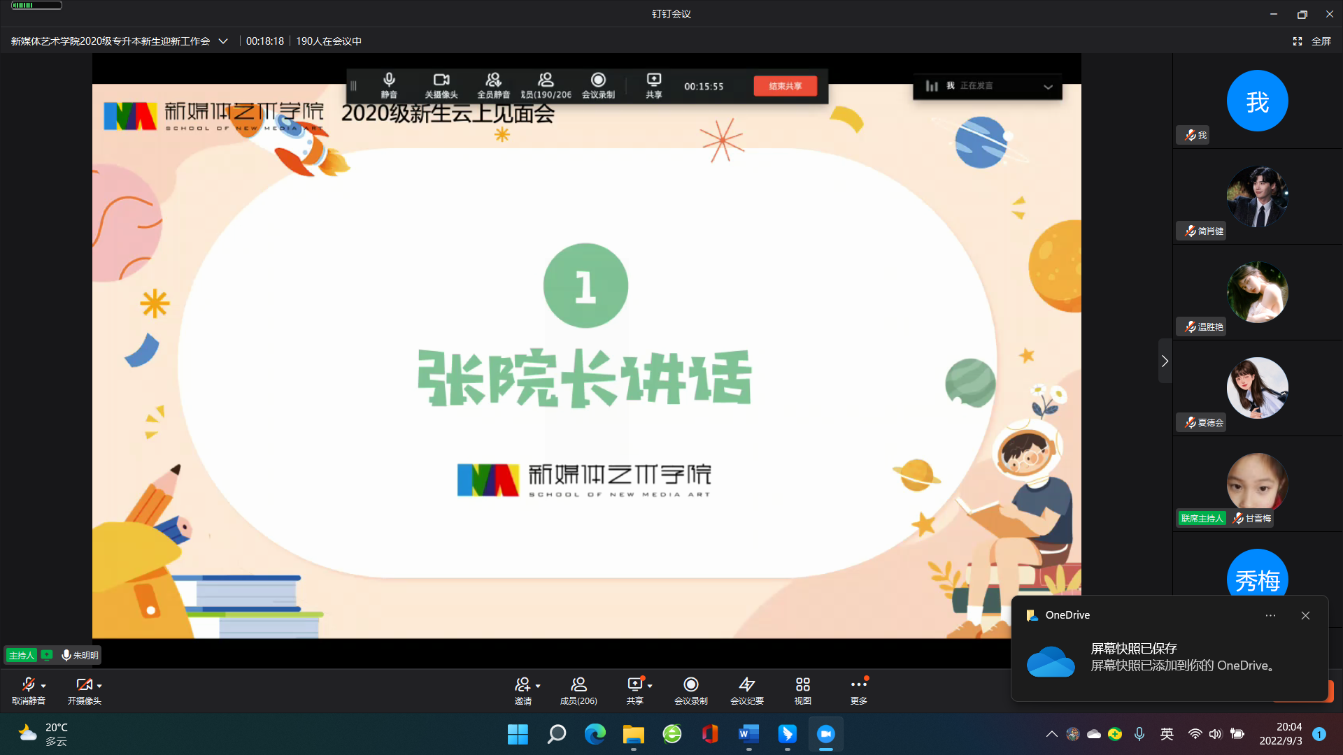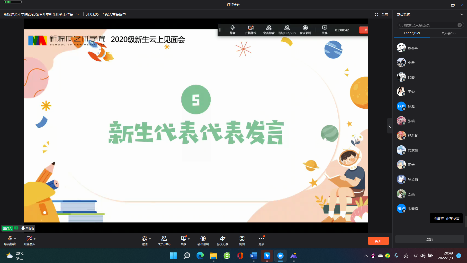会上,特别邀请了优秀毕业生2018级会展二班张唱同学分享她在校期间的成长历程。新生代表周昌祥在云端进行了发言,表示会珍惜机会,不负青春。新生班主任们也在线上与大家再次见面并送出祝福。