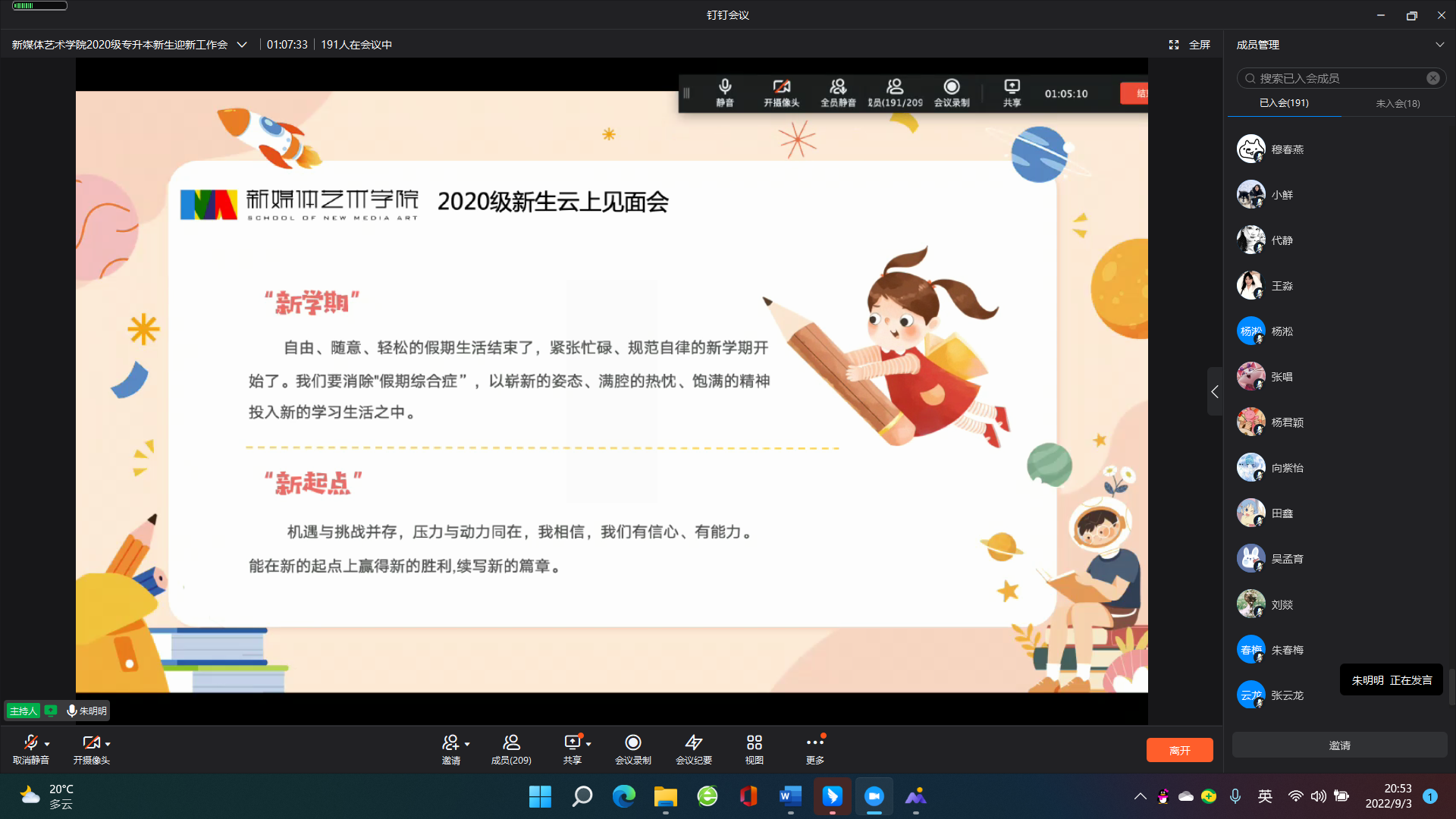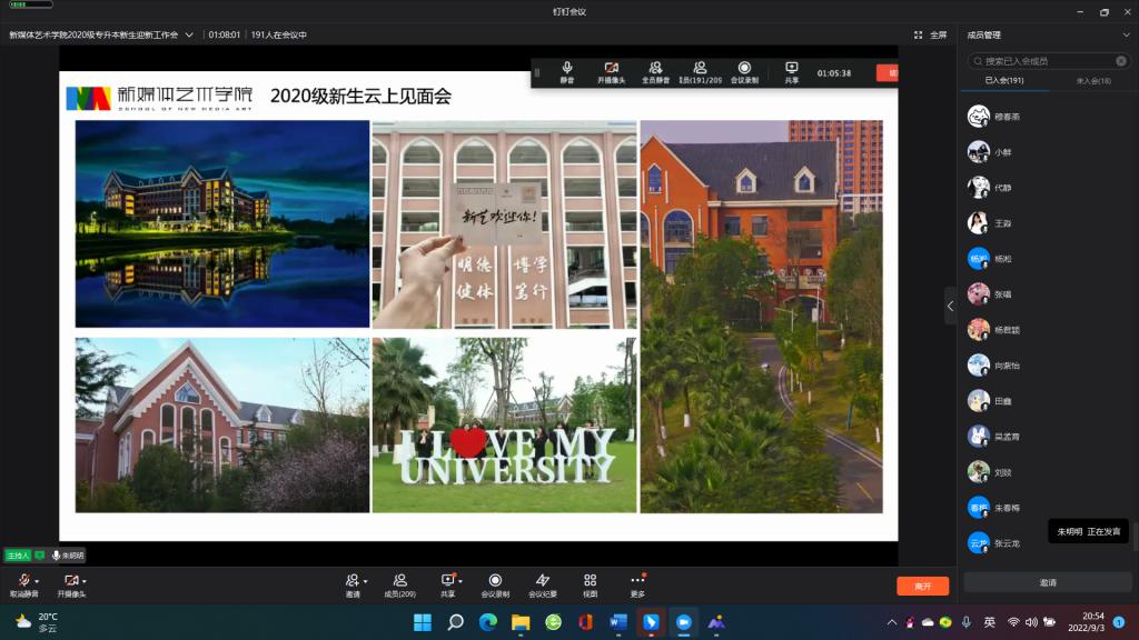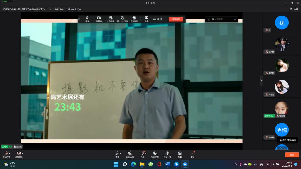 秋风送爽,我们又迎来了一个新的开学季。鉴于疫情影响因素,9月3日晚,新媒体艺术学院以“云端见面会”这一特殊的方式热烈欢迎200余名2020级专升本新生(以下简称:2020级新生)。我校新媒体艺术学院院长张红梅、党总支副书记甘雪梅、新生班级辅导员以及全体2020级新生参加本次云会议。会议由新媒体艺术学院团总支书记朱明明主持。