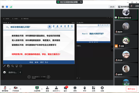 会上,贺晗首先向专升本新生详细介绍了学院发展历史、师资队伍、学科建设、人才培养模式及学校学位授予条件。其次,从教育理念、育人标准、管理模式等方面详细诠释了本科与专科的区别。最后,他深情寄语:“你的世界很小,外面的世界很大”,以此鼓励专升本新生要及时调整心态转变角色,以充满青春活力的全新面貌迎接新学校的新生活。