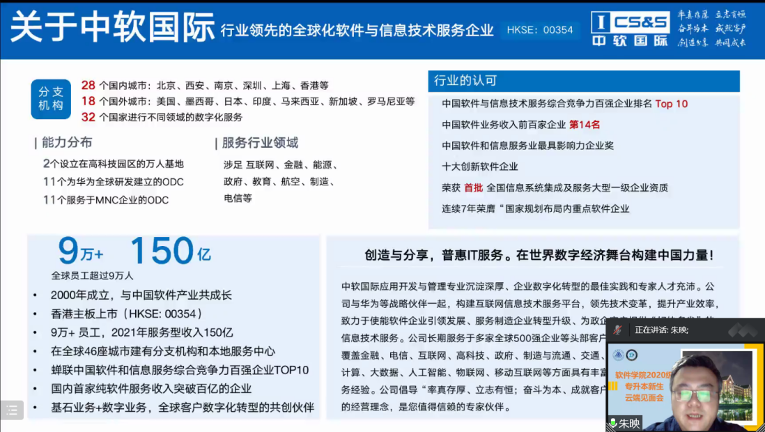 朱映介绍了共建产业学院,他向同学们讲解了中软国际的发展历史与业务规模,并介绍了中软国际在与高校、政府建立校企合作及数字人才基地等方面的丰富经验,并着重讲解了与大家息息相关的人才培养和人才就业服务环节。最后,朱映从“勤于思索、勤于动手、勤于动口”三个方面鼓励和鞭策同学们在学习过程中要善于思考,学会举一反三,时刻以高标准严格要求自我。
