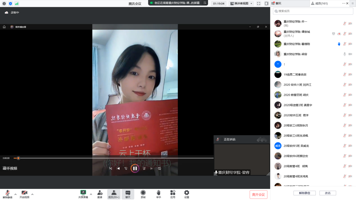 通过“云上干杯”环节,同学们纷纷晒出自己与录取通知书的合影。老生代表2020级吴灵鑫同学和新生代表黄以兰同学先后发言,鼓励新同学们明确目标、踏实前行。主持人用视屏展示了学院丰富多彩的校园活动,希望同学们的大学生活多姿多彩。