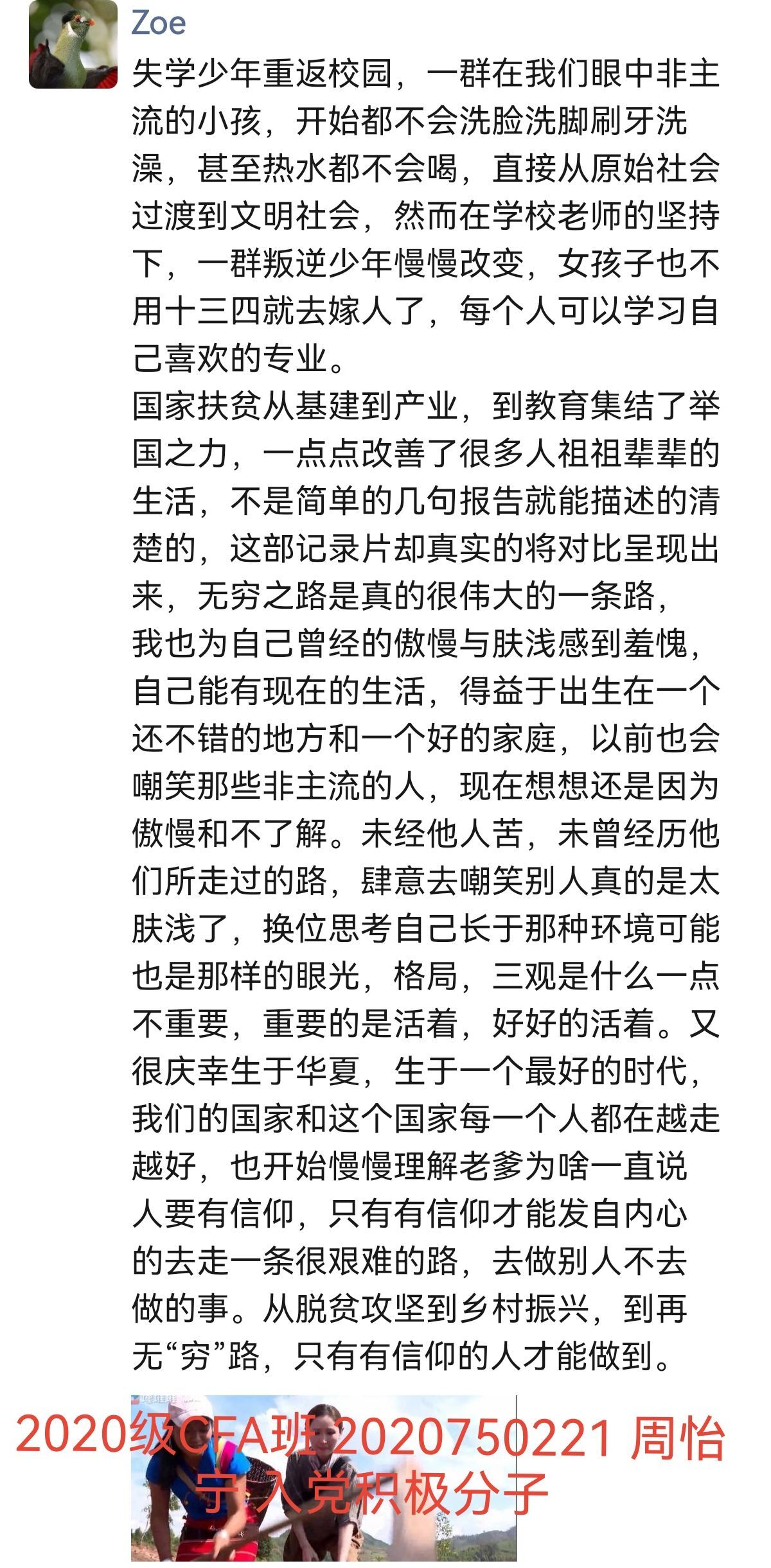 汲取脱贫之智,讲好中国故事。通过开展“汲取脱贫之智,讲好中国故事”党性教育活动,让学生党员和入党积极分子们跟随着《无穷之路》的主持人穿越崇山峻岭、戈壁沙漠,了解了一个个鲜活的人物与饱含真情的故事,感受着这片土地因为扶贫政策所产生的翻天覆地的变化,体会到国家“精准扶贫,科学扶贫”政策的真正内涵。参与本次活动的学生党员、入党积极分子共190名,共收集微信朋友圈感想截图358份。