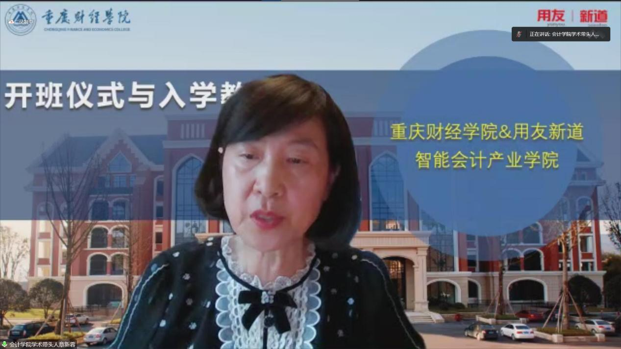 接下来,会计学院学科带头人章新蓉教授为大家介绍了智能会计产业学院的概况与优势。章教授表示:2022年是我校会计学专业整体向智能化方向转型的第一年,也是与新道企业合作的第一年。在这个特殊时期产业学院迎来了我校首届智能会计专业的同学,这是机遇,也是挑战。在专业优势方面,章教授将其分为“培养方案优势、师资安排优势以及实习与就业优势”三个部分进行详细地论述。最后她总结:转型是一个创新的过程,必定会遇到困难,希望学校与企业,以及同学们可以认真对待,共同发展。
