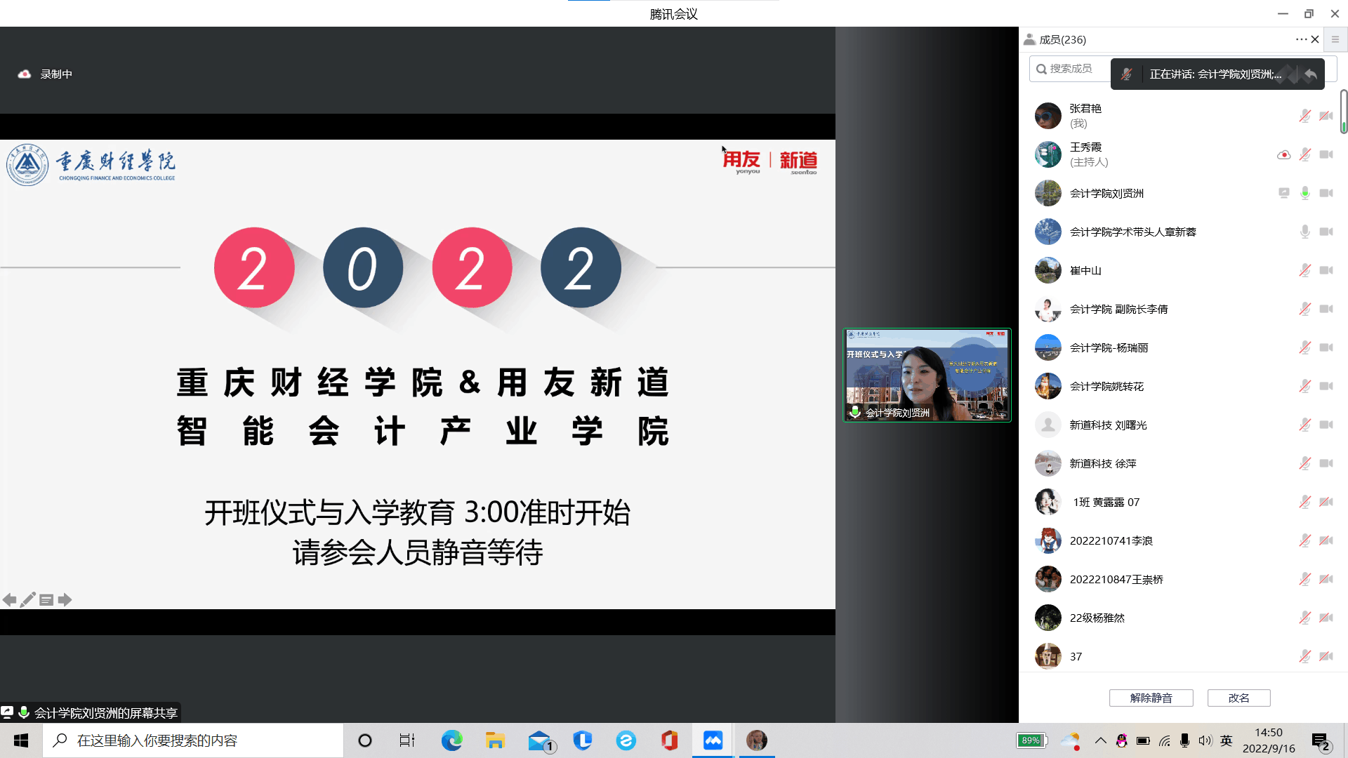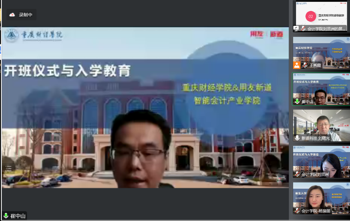 为推进校企合作,培养高质量会计人才,促进会计学院2022级新生对智能会计的了解,使新生进一步明确未来四年的发展目标,2022年9月16日下午,澳门新葡京博彩会计学院于线上举行了智能会计产业学院开班仪式与专业入学教育。参加本次会议的嘉宾有:澳门新葡京博彩校长助理崔中山、会计学院学科带头人章新蓉、会计学院副院长李倩、会计学院党总支书记姚转花、会计学院院长助理杨瑞丽、会计学教研室主任刘贤洲、会计学教研室副主任王秀霞,新道科技股份有限公司副总裁刘曙光、重庆分公司总经理徐福年、教务服务总监徐萍、校企合作经理莫正海、驻校导师朱小芳。会计学教研室主任刘贤洲老师主持了本次会议。