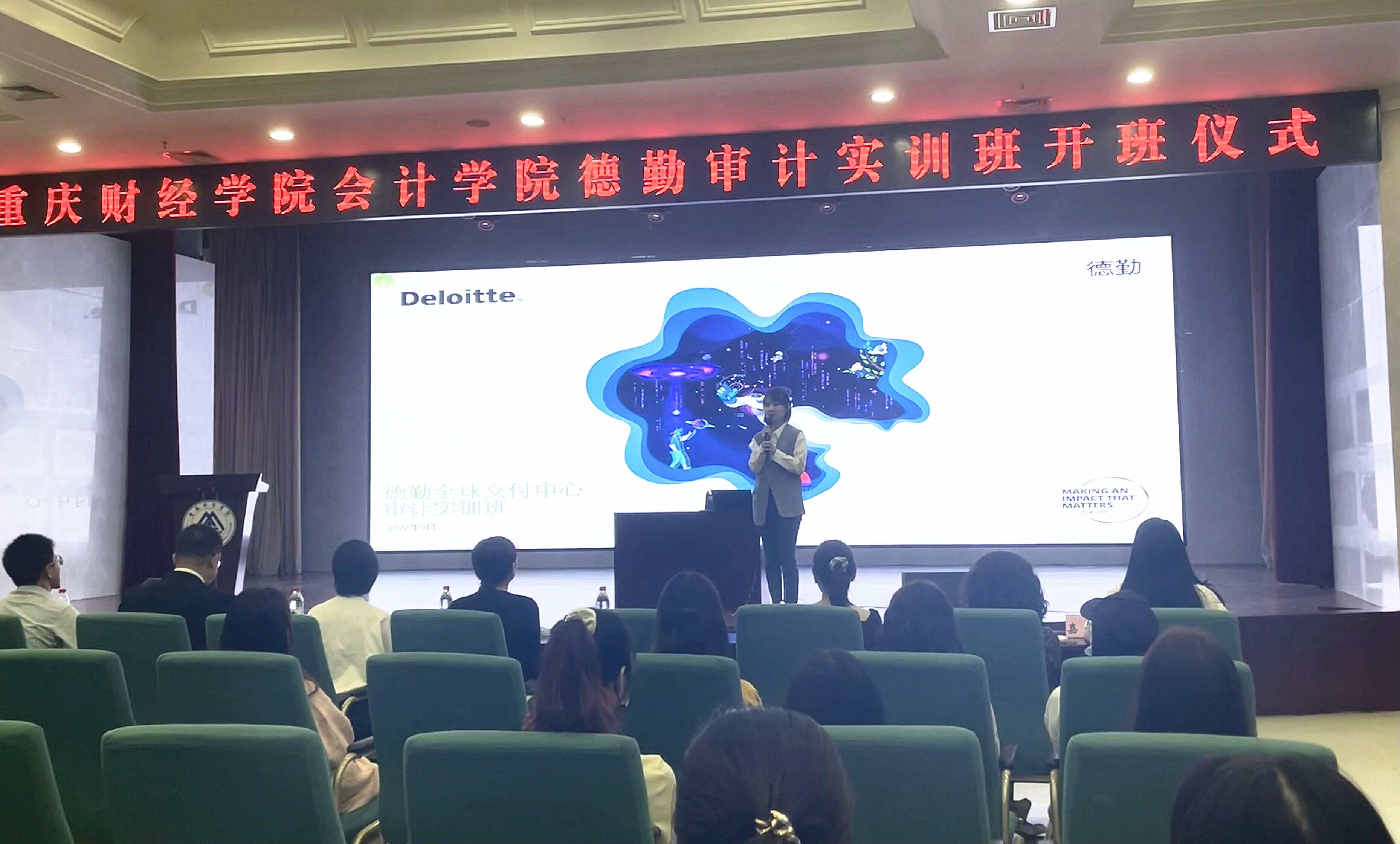 为顺应高等教育发展形势,深化落实产教融合,会计学院第三届德勤审计实训班于2022年9月28日在学术报告厅顺利举行开班仪式。本次仪式的参会人员有德勤全球交付中心合伙人葛明,人力资源高级经理全小莉,交付中心审计经理兼德勤班班主任宋佳、颜骊、秦雅婷、冉云,会计学院副院长李倩,党总支书记姚转花以及德勤班全体同学。