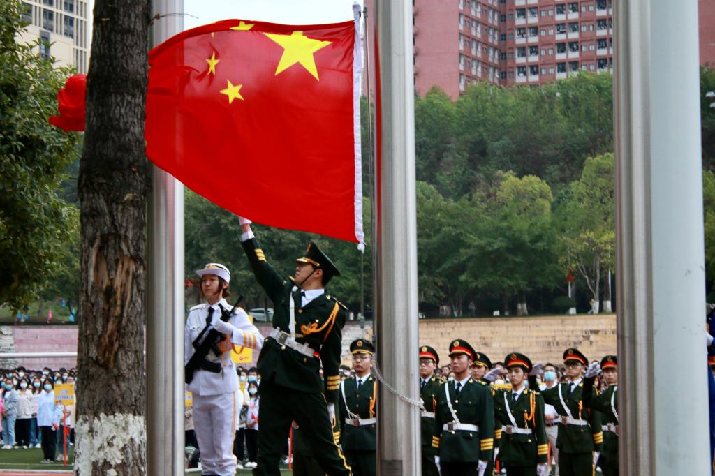 仪式在大学生艺术团快闪献唱的《我和我的祖国》歌声中拉开序幕......国旗护卫队英姿煞爽,迈着铿锵有力的步伐,护送鲜艳的五星红旗庄严入场。国歌声响,五星红旗冉冉升起,全体师生庄严肃穆行注目礼。