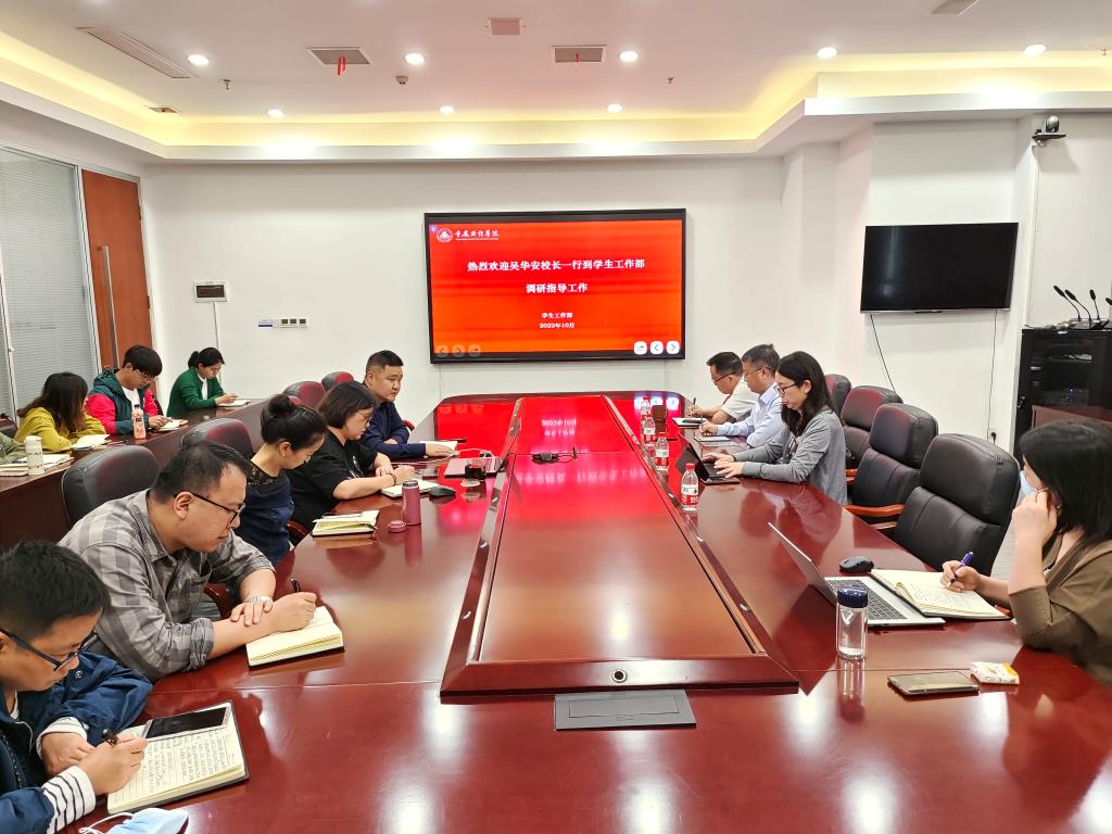 1021日下午,校长吴华安、党委副书记房朝君、副校长李春雷及党政办主任宋湘琴一行到学生工作部进行调研。学生工作部全体成员参加了会议,会议由学生工作部部长唐川川主持