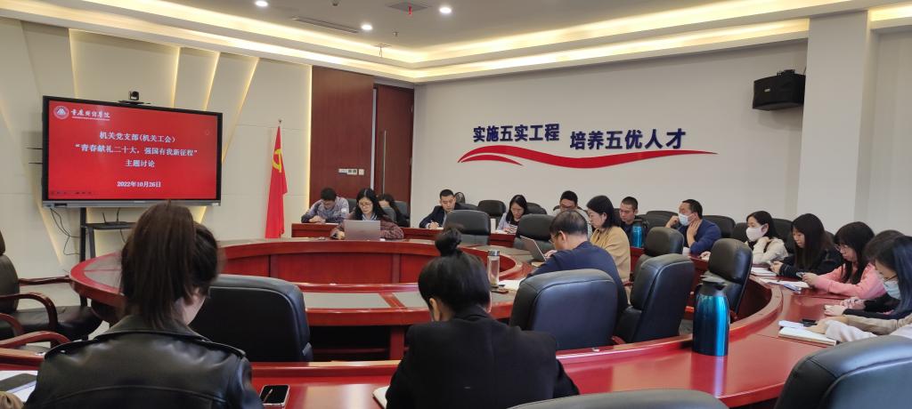 2022年10月26日下午,机关党支部召开会议,专题深入学习讨论党的二十大报告并研究部署学习宣传贯彻党的二十大精神。党委书记张毅以普通党员身份参加学习,机关党支部书记宋湘琴主持。