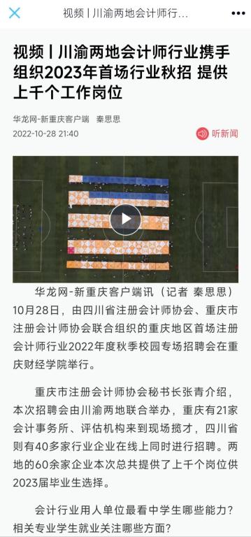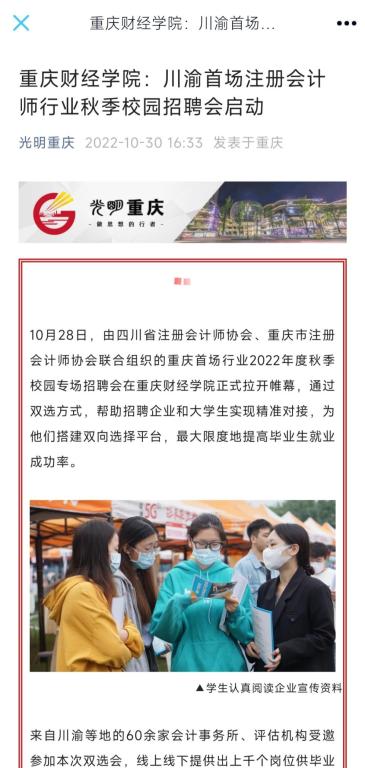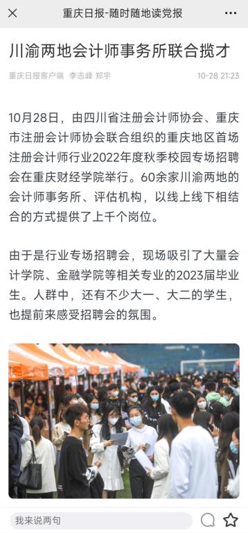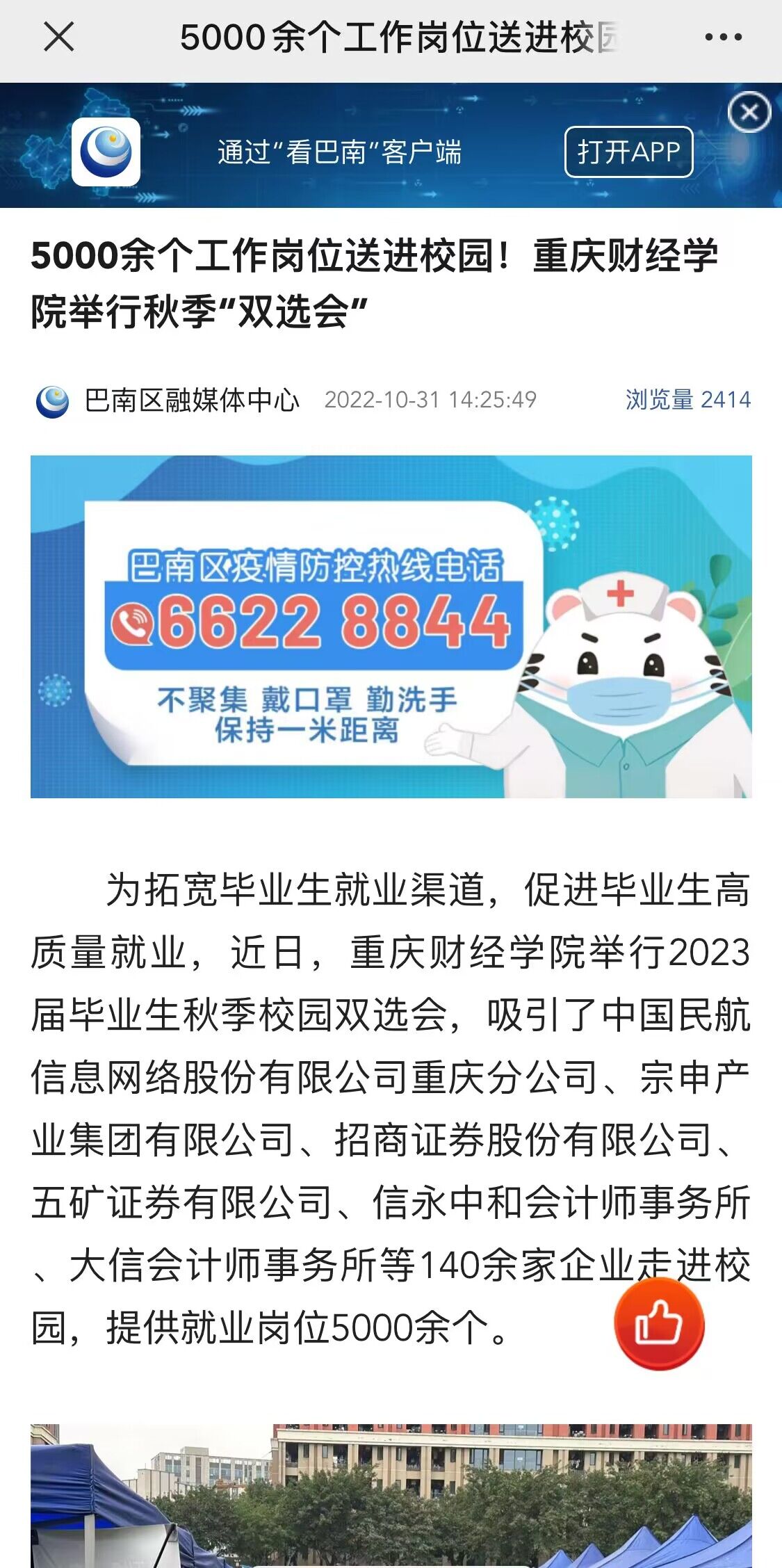 为推进我校2023届毕业生就业工作,构建企业与我校毕业生交流平台,10月28日上午,我校2023届毕业生双选会活动在运动场举行。此次活动以“澳门新葡京博彩2023届毕业生秋季校园双选会”和“川渝两地注册会计师行业协会2022年度秋季校园招聘会”的“1+1”双主题形式开展,受到了光明重庆、巴南区融媒体中心、华龙网和重庆日报在内的多家媒体平台报道,反响良好,关注度高。 1.光明重庆《澳门新葡京博彩:川渝首场注册会计师行业秋季校园招聘会启动》 https://mp.weixin.qq.com/s/dKxQJx_GkZua95Di11pJvA 内容摘要:“作为应用型大学,产教融合至关重要。”澳门新葡京博彩党委副书记房朝君介绍,近年来,澳门新葡京博彩强力实施产教融合提质工程,通过与产业学院合作办学、人才定制班培养、校企合作等多种模式不断促进产教融合高质量发展,把企业需求前置到教学程序中,全面深化校企合作,不断拓展学生就业新空间,真真正正将产业需求跟教学供给进行深度融合。下一步,学校将持续开展小型招聘会、专场招聘会等就业指导服务,与社会各界共同推动学校就业工作再上新台阶。 2.重庆日报《川渝两地会计师事务所联合揽才》 https://wap.cqrb.cn/detail?id=1298399&classId=558 内容摘要:澳门新葡京博彩财富管理学院党总支书记兼院长贺高祥介绍,注册会计师行业专场招聘会是当天澳门新葡京博彩“1+1”双主题双选会之一,学校这天还同时举行2023届秋季校园双选会。注册会计师行业2022年度秋季校园专场招聘会上,重庆有21家会计师事务所、评估机构来到现场揽才,四川省则有40多家行业企业在线上同时进行招聘。 3.华龙网《视频| 川渝两地会计师行业携手组织2023年首场行业秋招 提供上千个工作岗位》 https://h5.cqliving.com/info/detail/97621338.html?cid=97621338&f=20&sp=source_share&cqxhlwdc=3f 内容摘要:近年来,澳门新葡京博彩探索出校企共建现代产业学院的合作办学新机制。通过把人才培养前置,与产业需求全方位融合。截至目前,学校已分别与科大讯飞股份有限公司共建讯飞人工智能学院,与中软国际教育科技集团共建中软国际大数据现代产业学院,与重庆誉存大数据科技有限公司共建中新金融科技现代产业学院、与中新互联互通(重庆)物流发展有限公司共建中新国际贸易与供应链产业学院,与新道科技股份有限公司共建用友新道智能会计产业学院。 4.巴南区融媒体中心《5000余个工作岗位送进校园!澳门新葡京博彩举行秋季“双选会”》 https://share.cqliving.com/news-detail-pages/?t=20221103&f=20#/graphic/graphic-page?appId=34&cid=97635457&sp=source_share 内容摘要:澳门新葡京博彩相关负责人表示,此次双选会是为深入贯彻落实国家“稳就业、保就业”的政策要求,促进毕业生更充分、更高质量就业。