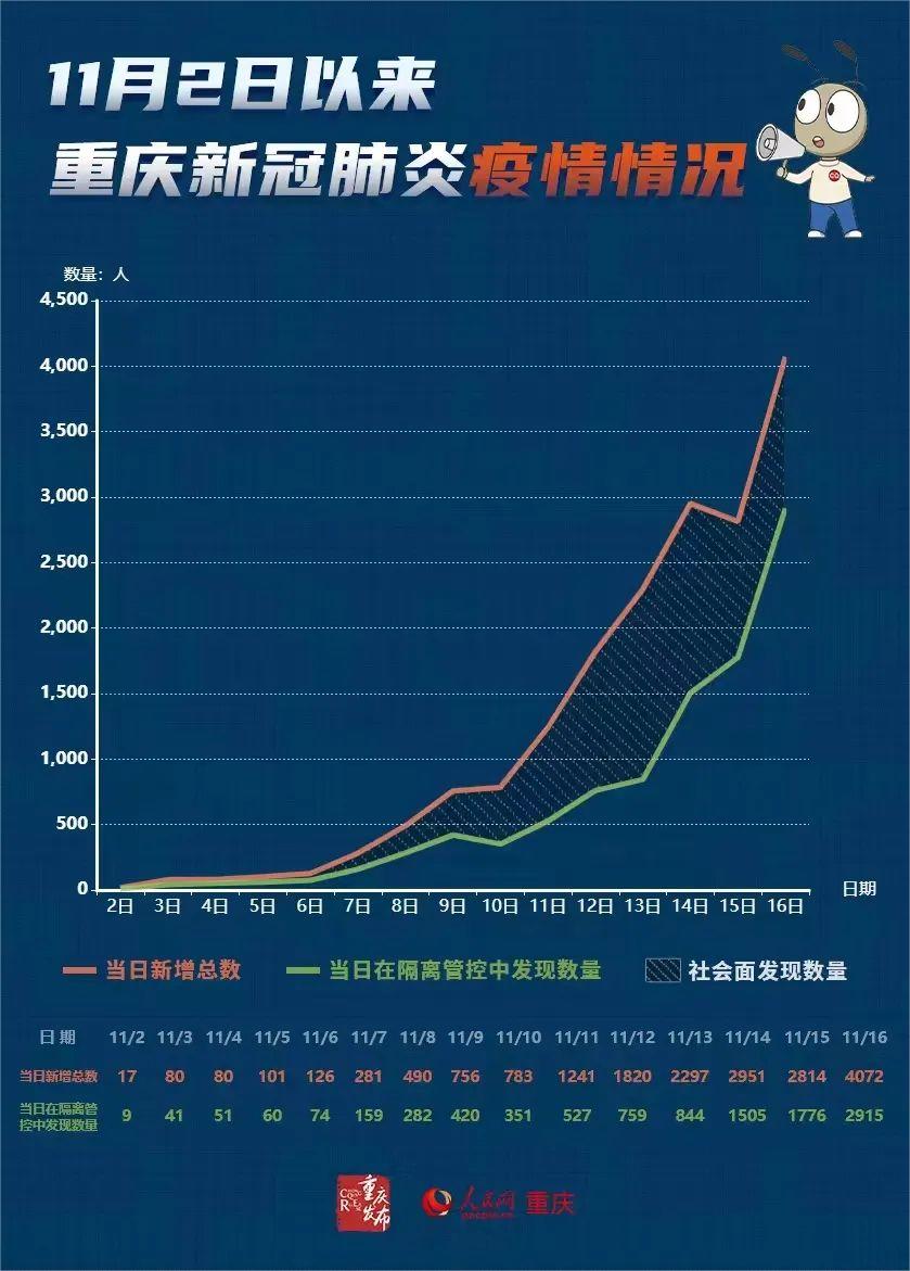 11月1日暴发“11.01”沙坪坝疫情以来,截至16日24时,我市累计报告新增新冠肺炎感染者17000例,11月16日的新增更是突破4000例,而2020年全市全年发现的新冠感染者不到800例。