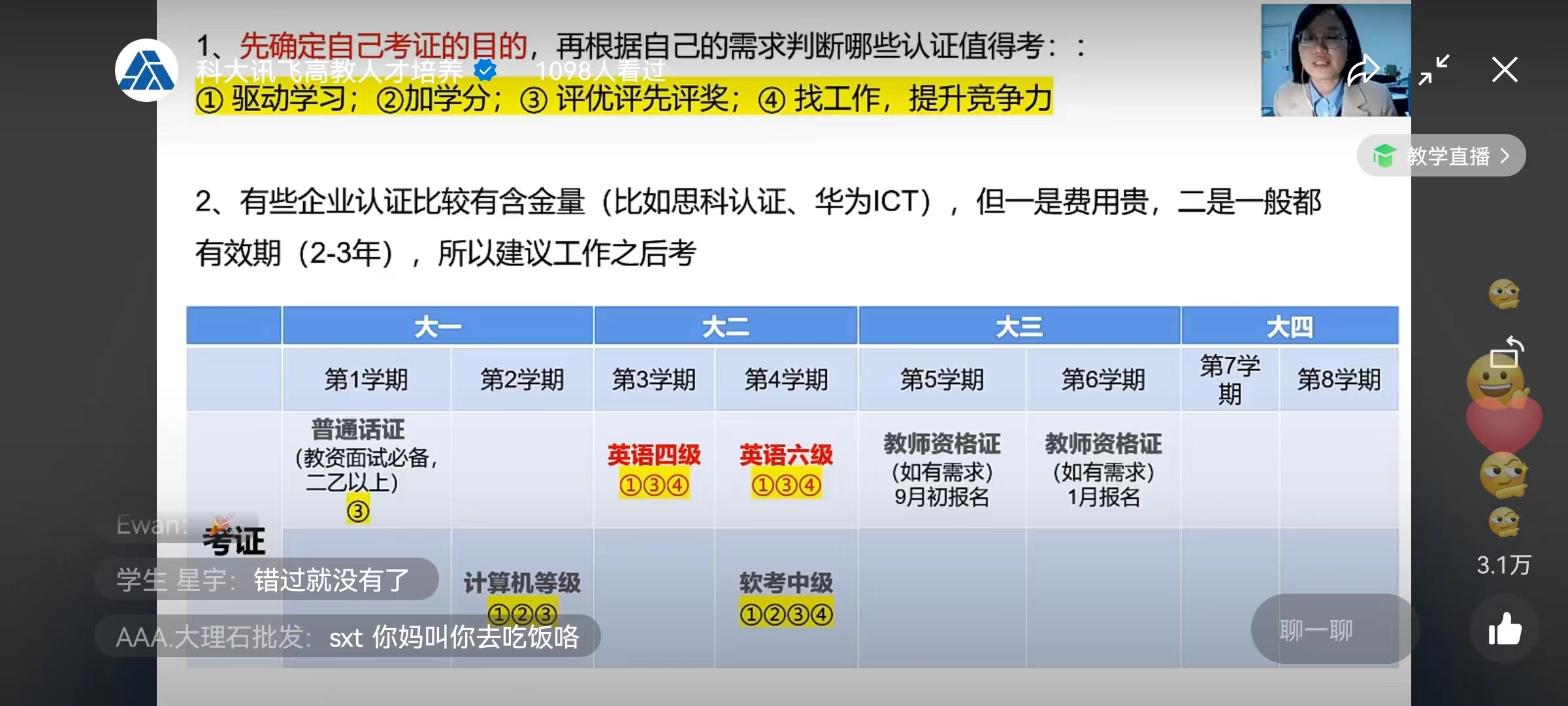 11月15日系列直播邀请科大讯飞软件技术方向高级工程师普拉托夫老师,带领同学们了解微服务的注册发现,本期主题适合有一定springboot的大二大三学生;11月21日邀请科大讯飞软件技术、物联网方向高级工程师飞鱼老师,带领同学们学习与探索更多商业实践项目中的具体技术难题;11月23日聚焦学科竞赛,特邀科大讯飞高级职业指导师与获奖学长为想要参与学科竞赛的同学们提供了详细的备赛经验分享。系列直播活动以微信视频号为直播途径,参与直播人数不受限,各年级同学均可同时参与。