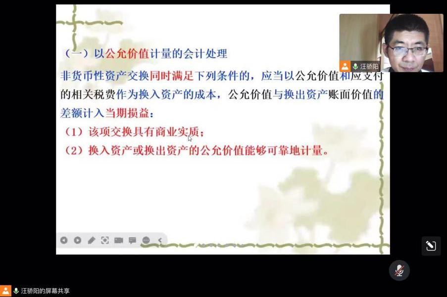 他积极投身于学校的疫情防控志愿者行列,担任起核酸扫码员的工作。他还肩负着线上教学的任务,脱下防护服,戴上耳麦,走进课堂。作为高级财务会计学课程组的一员,他运用雨课堂+腾讯会议共享屏幕、语音直播等方式,讲解难点、强调重点;在课下利用超星学习通辅导学生,进行“作业、习题+测试+讨论+答疑”,按照教学计划有序组织教学。同时汪骄阳老师还注重价值引领,更强调“敬畏生命”和“认真负责”的工作学习态度,将安全意识与专业知识入脑入心。他说,“病毒无情人有情,我们作为一名教师,就是学生的一道光!”