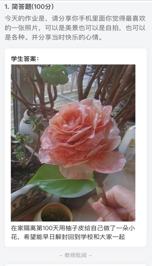 这是来自新疆的某同学提交的作业,自开学以来,由于疫情的阻隔,将她与学校分隔两地,在家隔离上网课的100天之际,她用柚子皮给自己做了一朵小红花,以期能够早日解封回到学校和老师和同学们相聚校园。