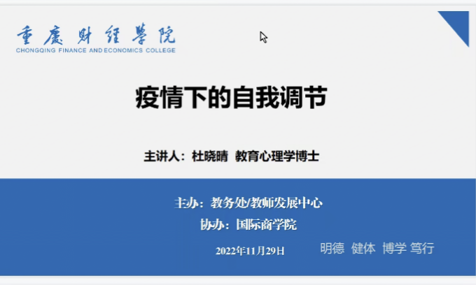 为进一步缓解疫情防控期间教职工的心理压力,减轻心理负担,确保广大教职工疫情期间的身心健康稳定,教师发展中心于11月29日晚组织开展“疫情下的自我调节”讲座。本次讲座以腾讯会议的形式进行,国际商学院杜晓晴教授担任主讲嘉宾,全校50余名教职工参加了此次讲座。