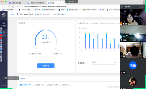 线上教学的学习效果保障是疫情期间各级各类学校关注与讨论的主要问题之一。为保证学生的线上课堂学习效果,李雪老师力求模拟现场教学的课堂观感。她要求学生必须“出镜”,以严谨、认真的姿态对待每一堂课,课堂上用随机点名、随机测试等方式,督促学生完成高质量学习。此外,李老师将雨课堂与Task Based Learning教学法相结合,将一些小组互动和任务放到课外进行,课上讲解知识点,课后将任务内容和推荐阅读或观看的资源传达给学生,从多个方面督促学生的学习,并及时了解学生的掌握情况,随时查漏补缺。