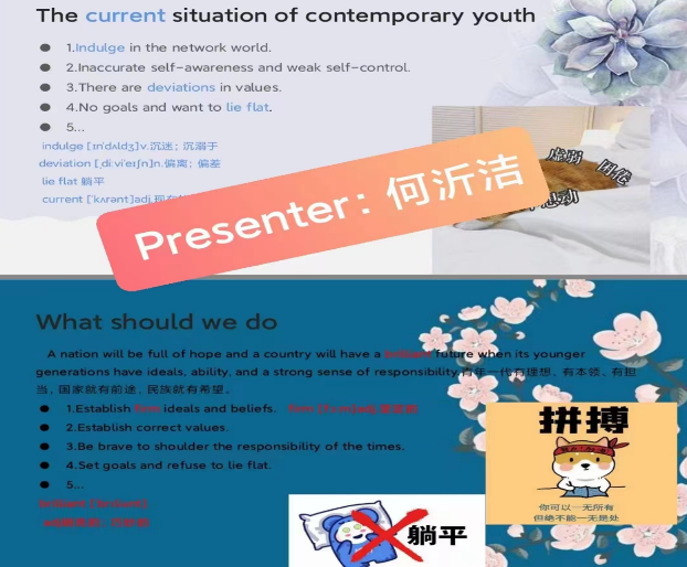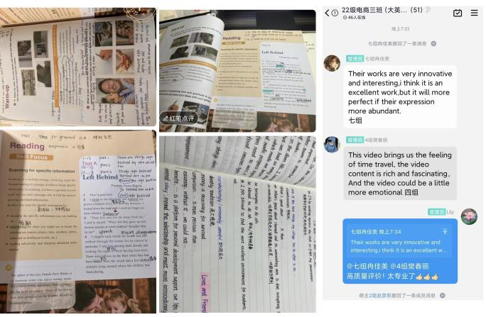 兴趣是最好的老师。在线上授课中,如何调动学生的学习兴趣与积极性,是教师们需要解决的首要问题。舒莉老师充分利用网络直播的趣味性和互动性,营造“课堂仪式感”,让学生主动参与其中;她将动感音乐、世界杯、“双11”等大学生喜欢和关注的话题,融入教学内容与教学过程,要求学生通过计时、投票、分组讨论、主题分享、互动批注等活动,与教师“同频共振”,达到读、写、译的具体教学目标。课后,舒老师以收集课堂笔记、分享原版外刊等方式来加强学生对知识的把握和应用,达到了学习效率翻倍的效果。