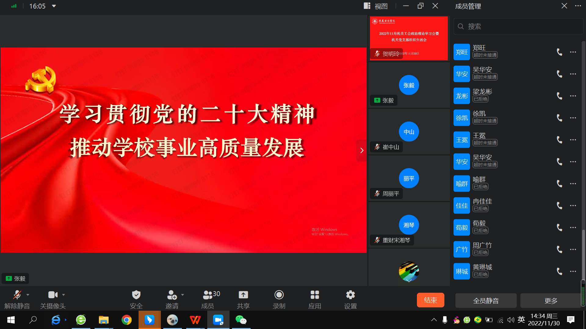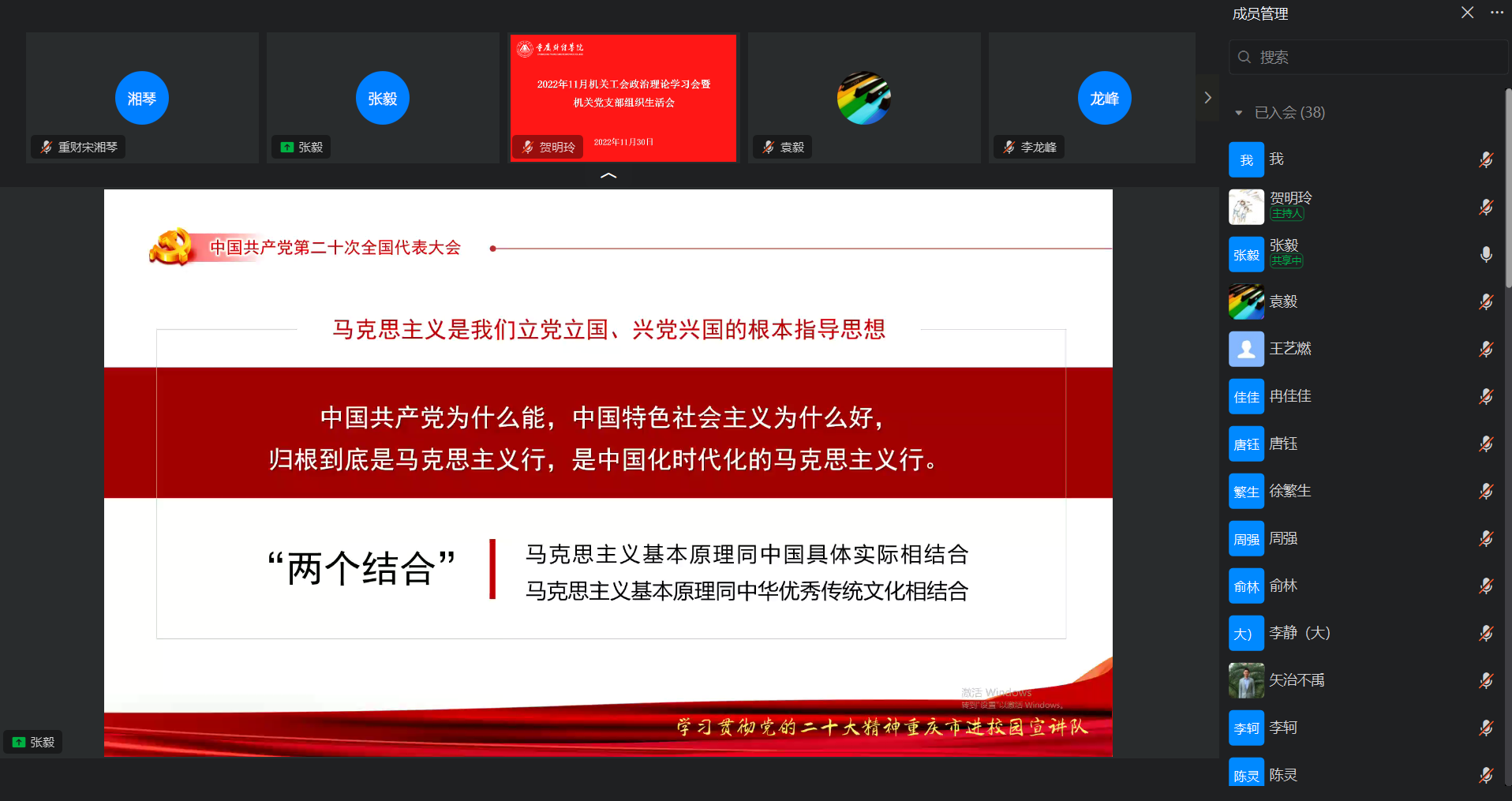 学校机关党支部于11月30日下午2:30通过线上方式召开11月党员大会,党委书记张毅深入宣讲党的二十大精神。校长吴华安、校长助理崔中山、校长助理张立以普通党员身份参会,与会党员结合工作实际积极参与讨论,畅谈学习体会。