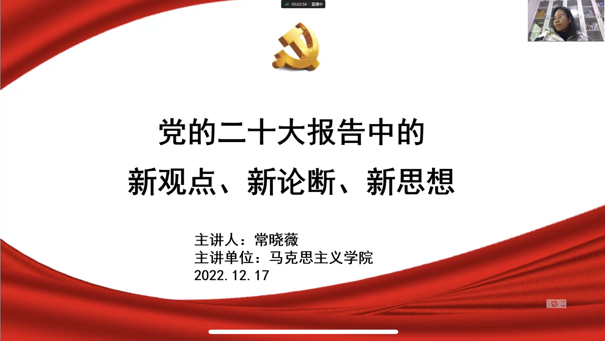 常晓薇以“党的二十大报告中的新观点、新论断、新思想”为主题,围绕党的二十大报告的精髓要义,从大会主题、从“两个务必”到“三个务必”、十年来三件大事等内容向学员们详细地解读了党的二十大报告。
