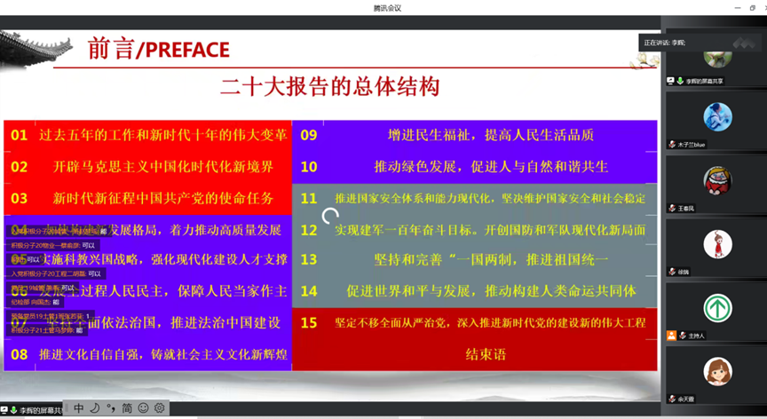 李辉重点从开辟马克思主义中国化时代化新境界和新时代新征程中国共产党的使命任务等方面作了解读。他指出,中国共产党为什么能,中国特色社会主义为什么好,归根到底是马克思主义行,是中国化时代化的马克思主义行。要学懂弄通做实习近平新时代中国特色社会主义思想,不仅要搞清楚道理学理哲理,更要领会蕴含的世界观和方法论,真正用以指导实践、推动工作。并为参会人员播放了《中国共产党(国际版)宣传片》。他希望,全体师生党员、入党积极分子,和青年学生要把思想和行动统一到学习宣传贯彻党的二十大精神上来,统一到党中央决策部署上来,要在“三个务必”上下功夫,树牢“四个意思”、坚定“四个自信”,做到“两个维护”。