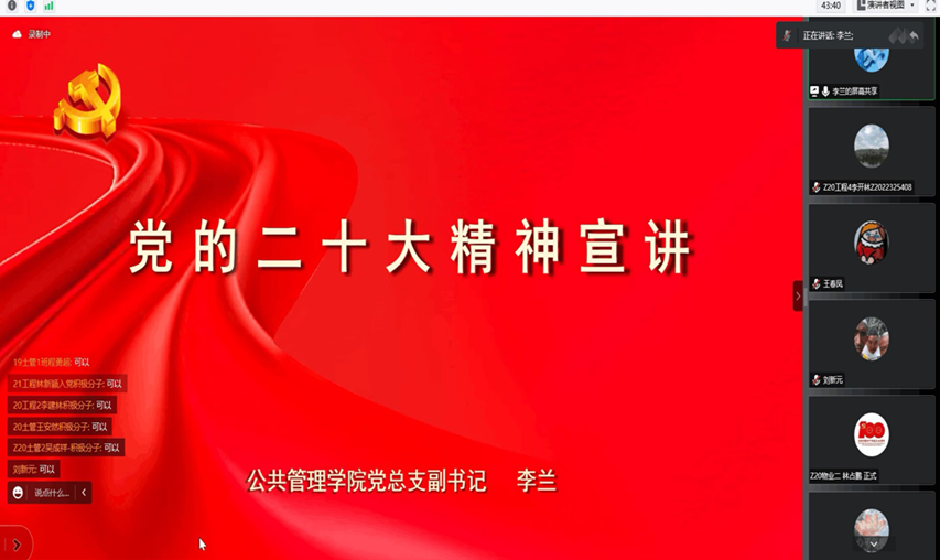踔厉奋发向未来勇毅前行担使命为推动党的二十大精神深入人心,进一步引导师生党员和青年大学生自信自强、守正创新、踔厉奋发、勇毅前行按照党委统一部署安排,我校公共管理学院于2022年12月开展党的二十大精神宣讲,学院党总支副书记李兰、学院副院长李辉为全体教师党员、学生党员及学生入党积极分子深刻解读党的二十大精神