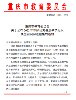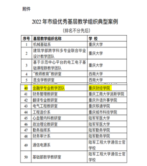 近日,重庆市教委下发了《重庆市教育委员会关于公布2022年市级优秀基层教学组织典型案例评选结果的通知》(渝教高函〔2022〕92号),我校“金融学专业教学团队”成功获评为市级优秀基层教学组织典型案例。