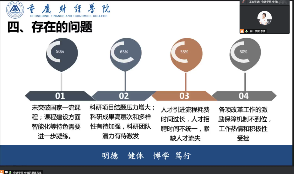 章新蓉指出,会计学科建设目前所取得的成绩得益于学校领导的大力支持和老师们的共同努力。同时指出会计专业硕士点的建设与会计学国家一流专业建设应齐头并进,在建设好会计学国家一流专业的同时进一步助推会计专硕点的建设。