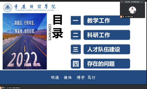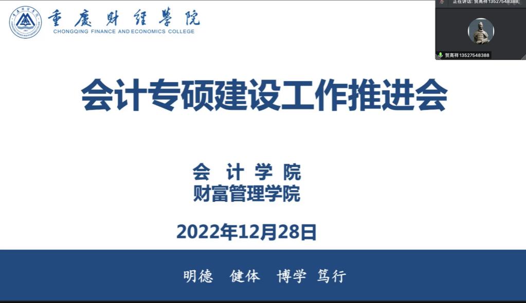 12月28日下午,会计学院、财富管理学院线上召开了会计专硕建设工作推进会。校长吴华安教授、校长助理张立、校长助理崔中山、会计学学科带头人章新蓉、科研处副处长袁毅、财富管理学院院长贺高祥、会计学院副院长李倩及会计学院、财富管理学院全体专职教师参会,会议由贺高祥院长主持。