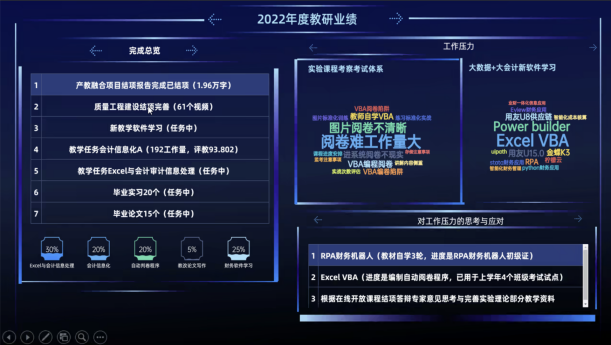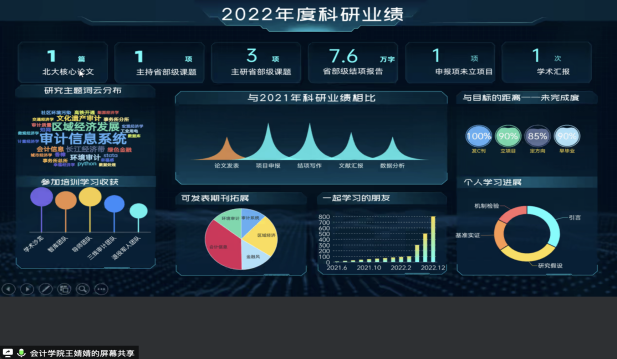会计学院教师代表王婧婧以大数据的形式向大家分享了其2022年度的科研及教研工作亮点。她表示在新的征程上,我们要不断加强学习和实践,始终保持一往无前的奋斗姿态和永不懈怠的精神状态,才能不负学校、学院、学生,不负机遇和未来。科研处袁毅副处长对于会计专硕建设已取得的成果表示祝贺,同时也表示科研处将不遗余力的支持。