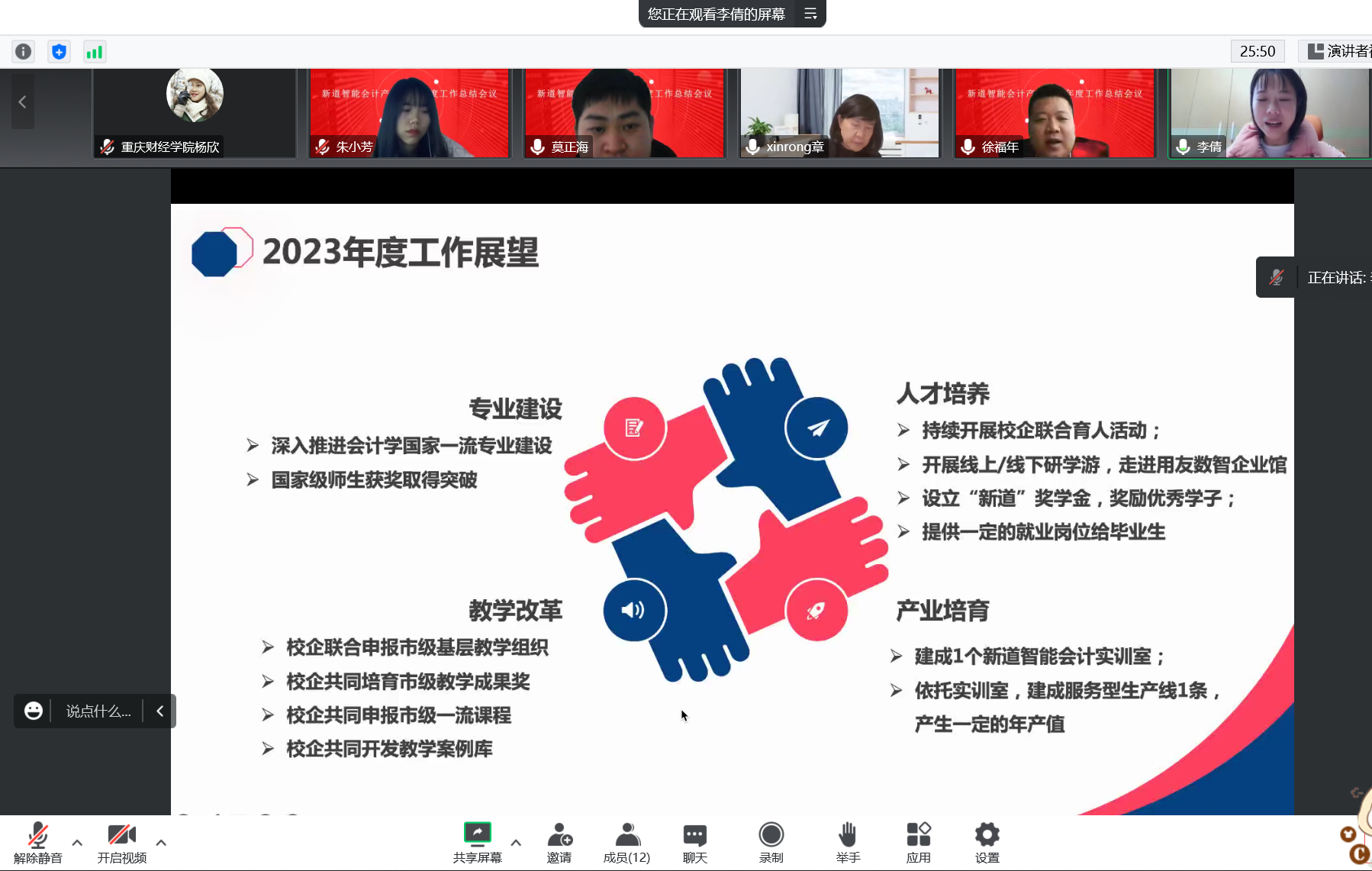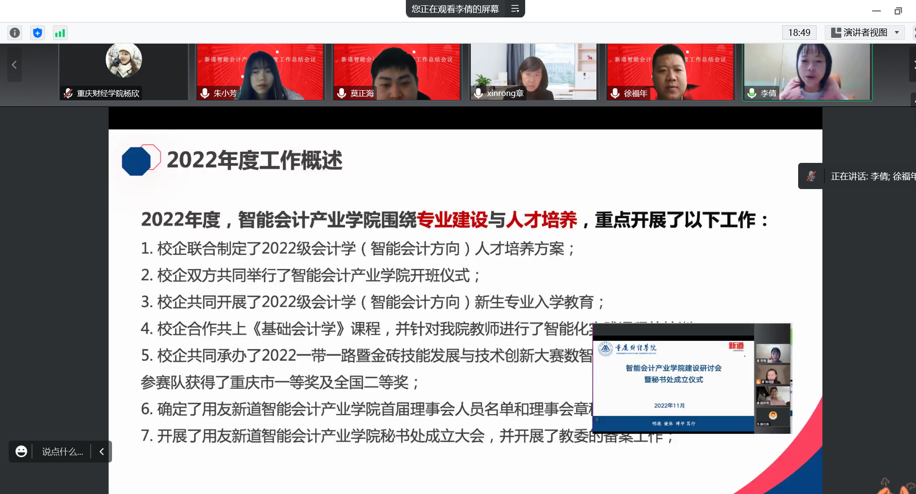 本次会议是对新道智能会计产业学院一年工作的总结,在总结中发现不足,并厘清思路。本次会议也是新道智能会计产业学院对新的一年的工作展望,为产业学院在新的一年指明了工作方向。