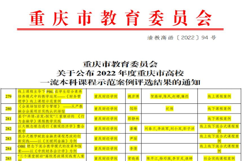 近日,重庆市教委发布了《重庆市教育委员会关于公布2022年度重庆市高校一流本科课程示范案例评选结果的通知》(渝教高函〔2022〕94号),我校《线上课程主导下PBL在学生综合素养培养模式中的教学运用——<财务管理学>线上课程示范案例》等7个课程案例获得认定。其中,1个线上课程案例,2个线下课程案例,3个线上线下混合式课程案例,1个社会实践案例。