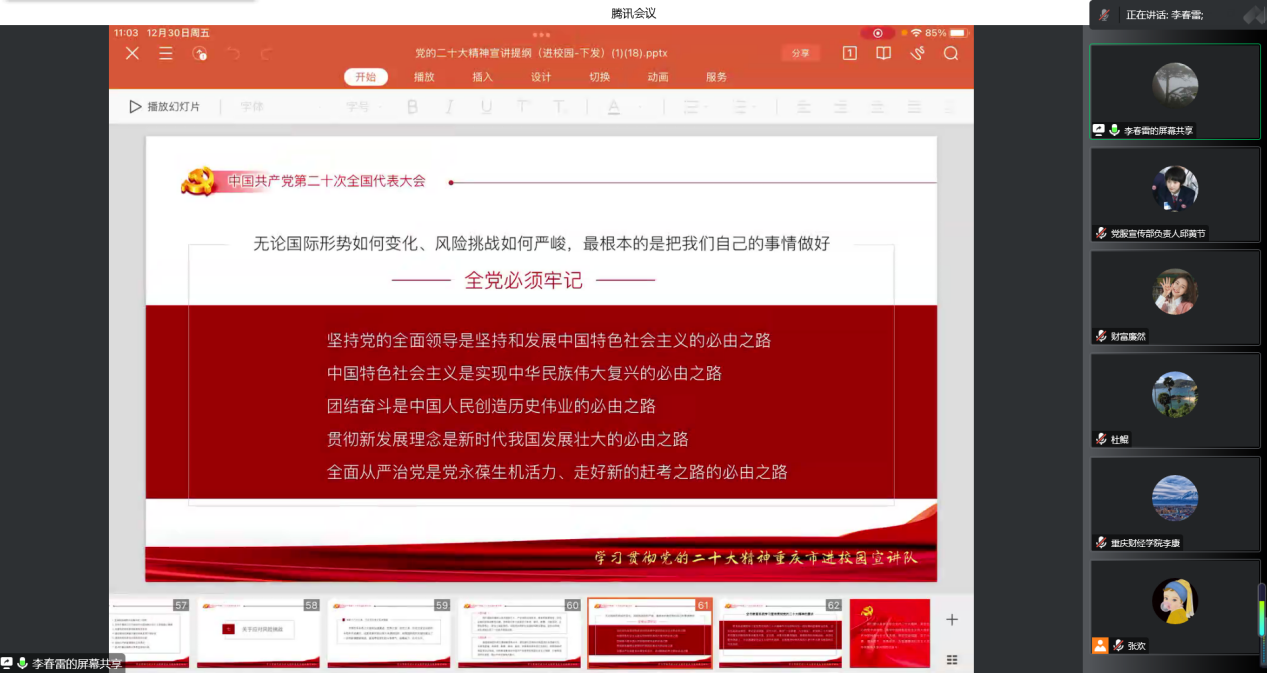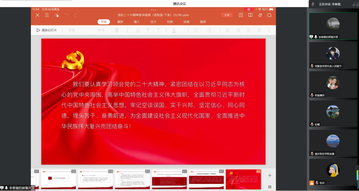 为深入学习贯彻宣传党的二十大精神,推动党的二十大精神入脑入心、落地生根。1230财富管理学院特邀副校长李春雷作为主讲嘉宾以线上形式举行了党的二十大精神宣讲会。会议由财富管理学院教师党支部书记张欢主持。