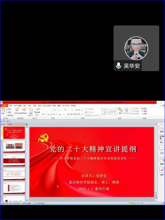 为深入学习贯彻党的二十大精神,2023年1月5日,教辅党支部、金融学院党总支在钉钉会议上组织召开学习贯彻党的二十大精神宣讲会,校长吴华安担任主讲人。教辅党支部、金融学院党总支100余人参加宣讲会。本次宣讲会由罗婷婷书记主持。