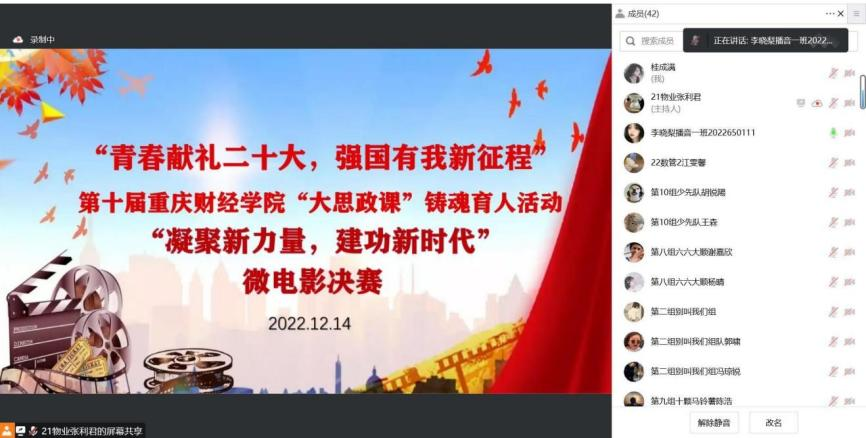 12月14日中午,我校通过线上会议成功举办了“青春献礼二十大,强国有我新征程”——第十届“大思政课”铸魂育人活动之“凝聚新力量,建功新时代”微电影决赛。我校马克思主义学院院长常晓薇副教授、党总支副书记崔文卿,公共管理学院党总支副书记李兰以及马克思主义学院思想道德与法治教研室主任周敏、专职教师高雪莲担任了本次比赛评委。