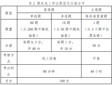 课程组根据课程特点和学生在线教学情况,精心设计考核内容改进考核方式,加大过程性考核力度,提高平时成绩在总成绩中的比例(见表1),因地制宜制定政治经济学期末考试考核方案见表2,为线上期末考试做好充分准备具体环节包括: