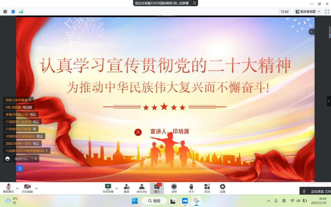 为深入领会党的二十大重要精神,引导广大师生坚定不移听党话、跟党走,财富管理学院以全国“样板党支部”创建为契机,以学习贯彻宣传党的二十大精神为主要内涵,由学院领导教师、辅导员、学生党员组建成立“学习宣传贯彻党的二十大精神”师生宣讲团,打造二十大精神专题学习班,以主题宣讲为方式载体,积极组织开展线上线下二十大精神专题宣讲会,持续感染、引领和激励支部成员,用实际行动学习贯彻党的二十大精神。