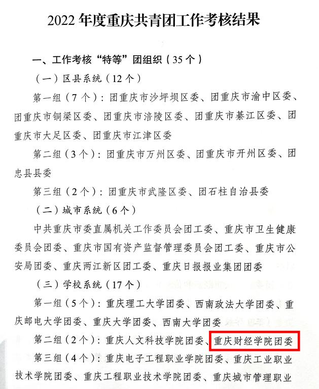 近日,共青团重庆市委五届九次全会胜利召开,会上通报了2022年度重庆共青团工作考核结果,我校团委在本次目标考核中获评为“特等”,截至目前,我校团委已连续五年荣获该项殊荣!