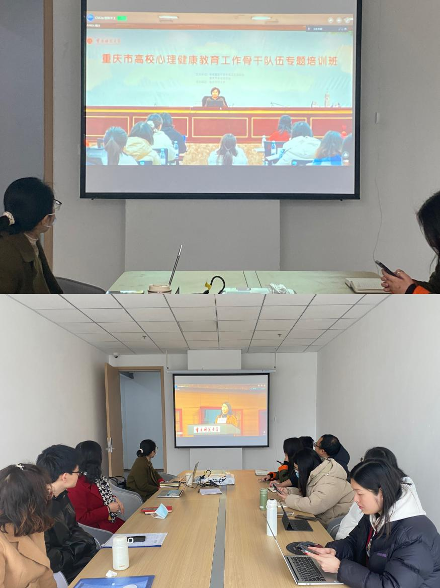 为深入学习宣传贯彻党的二十大精神,不断强化高校心理健康教育工作队伍建设,2023年2月24-25日,我校学工部组织开展“重庆市高校心理健康教育工作骨干队伍专题培训”线上集中学习活动,学校心理健康教育与咨询中心工作人员、辅导员全员参加。为加强学习效果,学工部特组织部分辅导员于24号上午10:00-12:00G1-105研讨室进行线下集中观看学习。此次培训以“新时代高校心理育人创新与实践”为主题,培训内容包含《大学生自杀危机的干预策略》、《格式塔疗法在学校的应用》、《大学生心理健康“医校联动”操作与实践》三场专家报告。