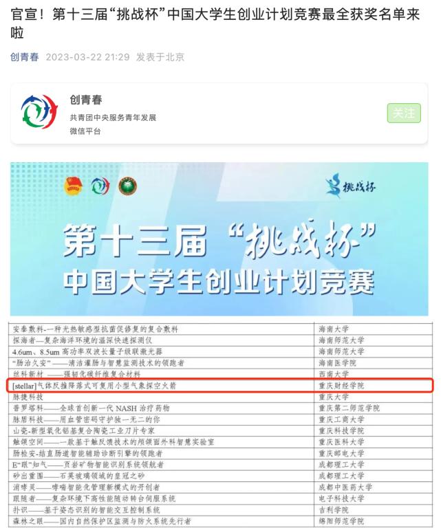 日前,由共青团中央、教育部、人力资源社会保障部、中国科协、全国学联和北京市人民政府主办,北京理工大学、共青团北京市委、北京市房山区人民政府承办的第十三届“挑战杯”中国大学生创业计划竞赛全国决赛在北京落下帷幕。我校讯飞人工智能学院作品《[stellar]气体反推降落式可复用小型气象探空火箭》斩获全国赛“铜奖”,截至目前,我校已连续两届在“挑战杯”中国大学生创业计划竞赛中取得国家级荣誉!