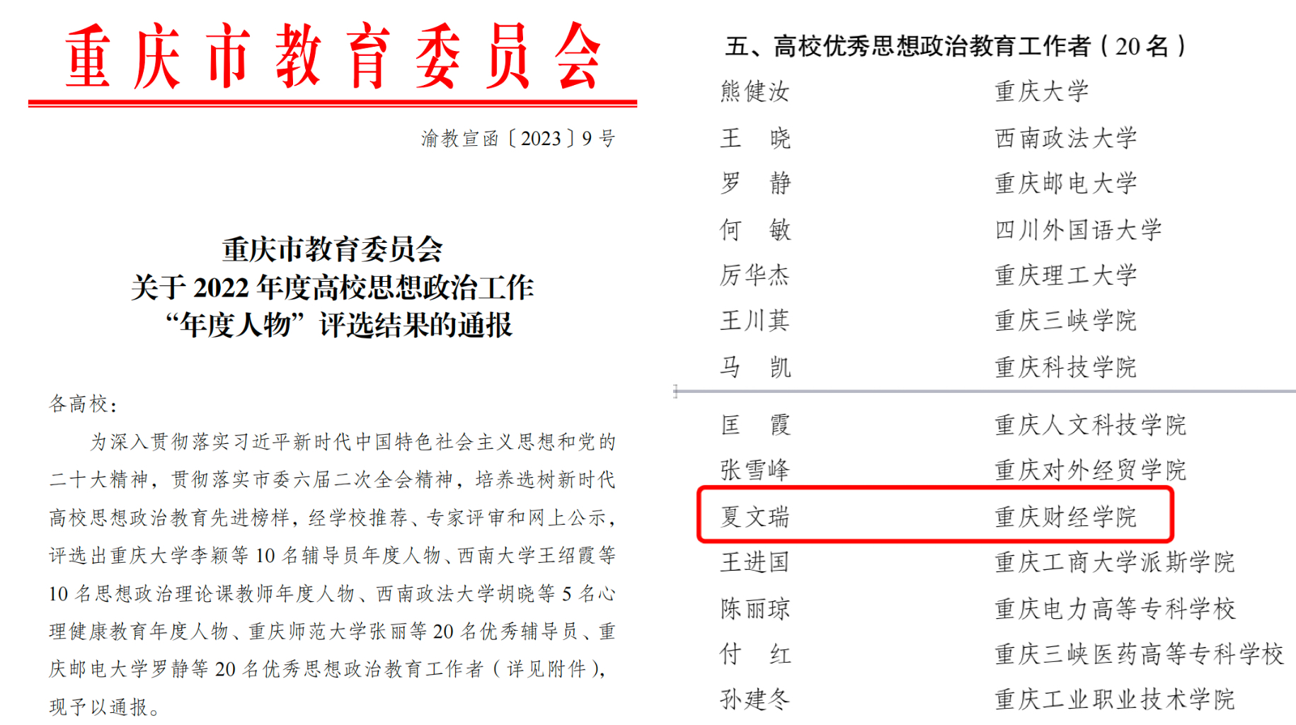 日前,重庆市教育委员会关于2022年度高校思想政治工作“年度人物”评选结果公布,我校团委书记夏文瑞被评为2022年度高校优秀思想政治教育工作者。