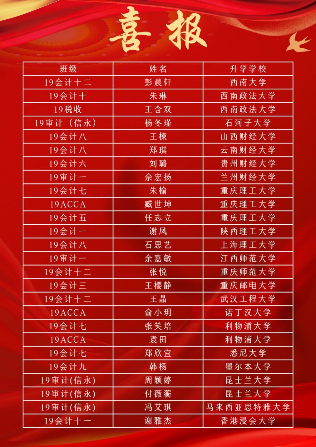 星光不负赶路人,天道酬勤佳音来。随着2023年各高校考研录取工作逐步完成,我校会计学院捷报频传。在校、院领导的大力关心与支持以及全体师生的共同努力下,会计学院2023届毕业生中一批学生成功考入国内外知名高校,其中,有7名毕业生获得了全球QS排名前200的知名大学offer。