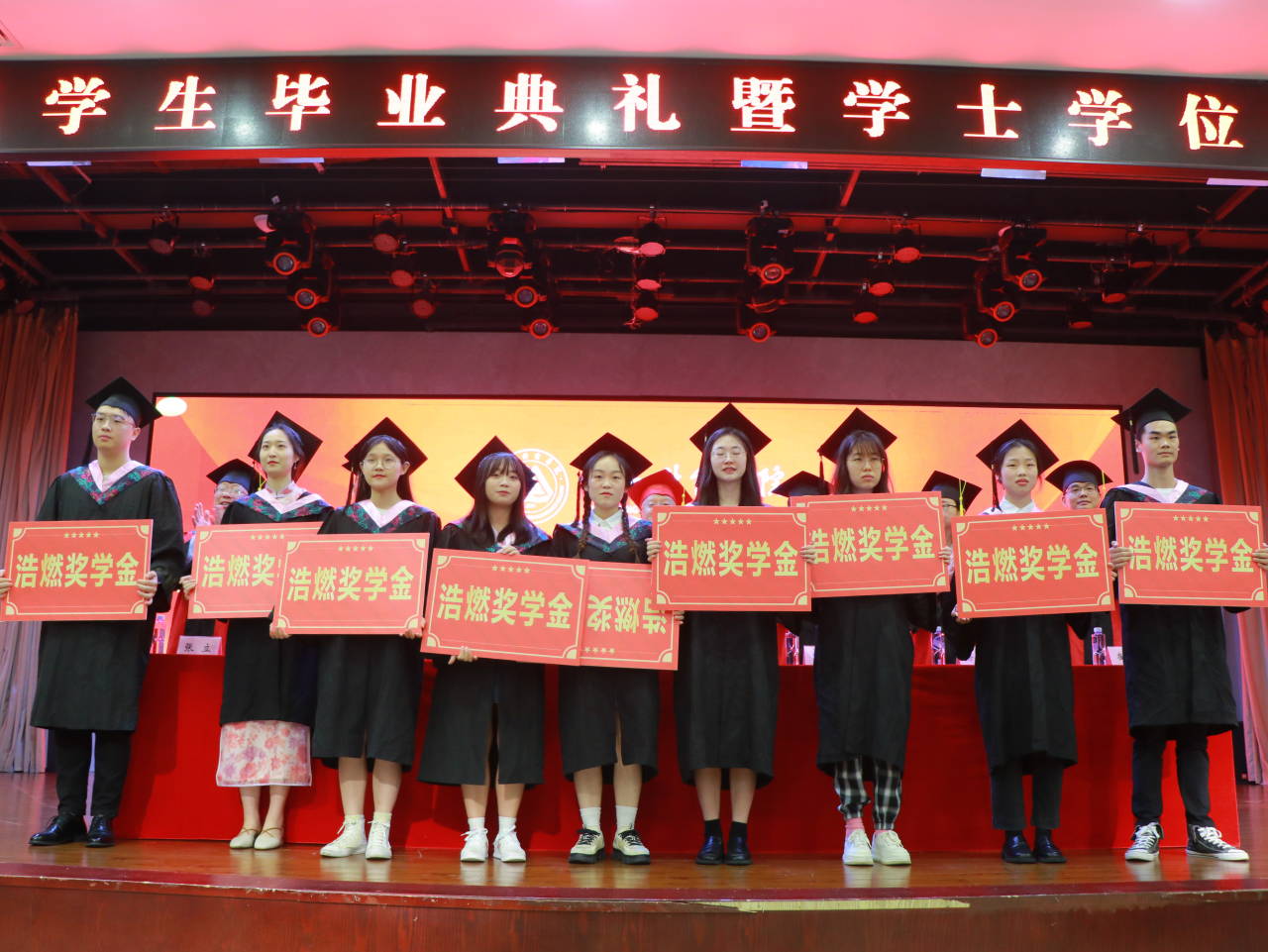 会上,党委书记张毅宣读市级、校级优秀毕业生相关文件,副校长沈民宣读考取研究生相关文件、“浩燃奖学金”获得名单,同学们自信从容走上领奖台,收获自己的成长与进步;校长助理崔中山宣读准予毕业及授予学士学位的相关文件,校长吴华安为毕业生授位并行拨穗礼,期间亲切与同学们互动合影,并表示热烈祝贺。同学们主动与吴校长或比耶或握手或拥抱,激动与喜悦洋溢在每个人的脸上。