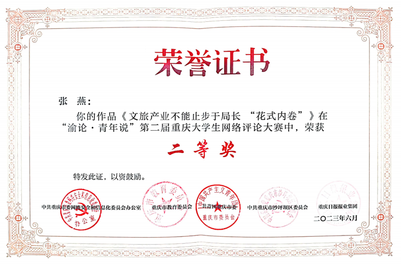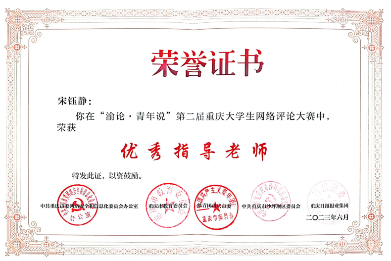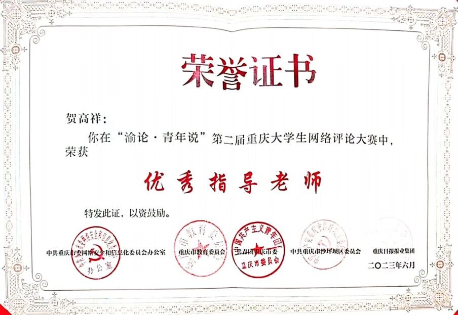 6月20日,“渝论·青年说”第二届重庆大学生网络评论大赛在重庆大学落下帷幕。在此次大赛中,我校荣获二等奖一项、三等奖一项、优秀奖二项,贺高祥、宋钰静获评为指导教师,同时我校宣传部与重庆大学、西南大学等10所高校宣传部一同获评为“优秀组织单位”。