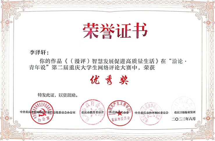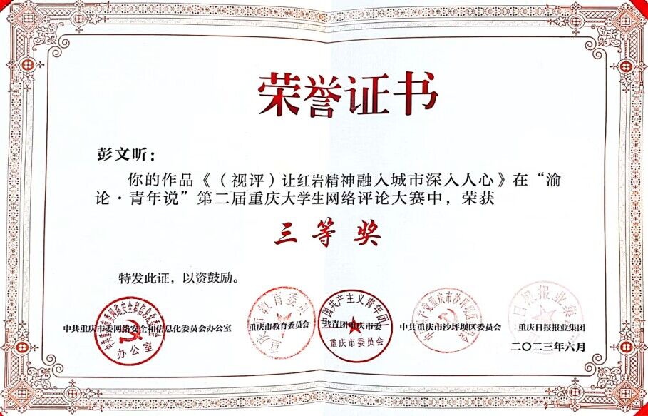 “渝论·青年说”第二届重庆大学生网络评论大赛是由市委网信办、市教委、团市委、沙坪坝区委和重庆日报报业集团联合主办,重庆日报(重庆日报网)承办,全市各高校党委宣传部协办的市级重要赛事,该大赛以网络评论的形式构建青年话语,凝聚青年共识,传播青年声音,为青年话语赋能,开辟了网络舆论引导的青年阵地。在大赛中,我校党委宣传部认真组织、广泛动员,通过深入学院宣讲、落实激励措施、搭建沟通平台、集中培训指导等方式鼓励师生们积极参赛期间,组织投稿300余篇,在重庆日报公开发表24篇,形成了良好的舆论影响。