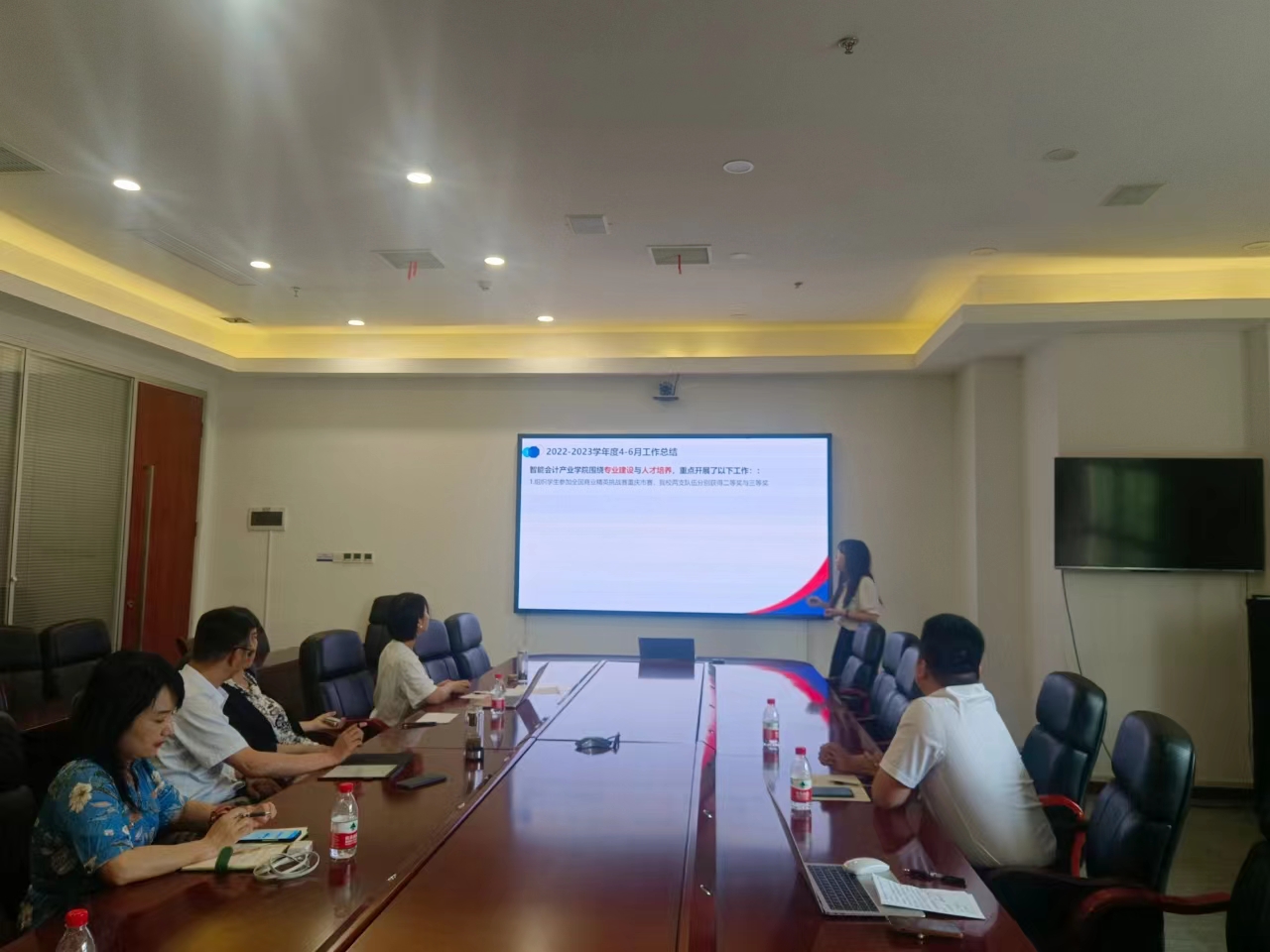 会上新道科技股份有限公司校企合作经理莫正海从设计理念具体建设方案到未来实训室发展展望等方面向理事会汇报了产业学院实训室建设的具体规划驻校导师朱小芳向理事会汇报2022-2023学年第二学期4-6月的工作总结并从人才培养端和师资研修方面汇报了暑期及下学期的教学工作计划