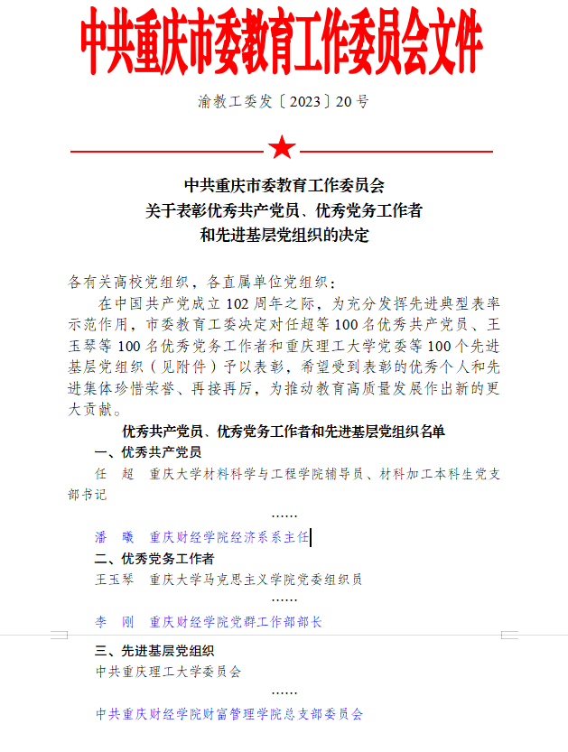在全国喜迎党的102岁华诞之际,近日,市委教育工委下发《关于表彰优秀共产党员、优秀党务工作者和先进基层党组织的决定》(渝教工委发〔2023〕20号)表彰文件,学校经济学院经济系系主任潘曦、党群工作部部长李刚、财富管理学院党总支分别被评为重庆市教育系统“优秀党员”“优秀党务工作者”“先进基层党组织”。此次表彰是学校首次获得市级“两优一先”先进个人殊荣,同时,也是学校二级党组织连续两次获得市级“先进基层党组织”。