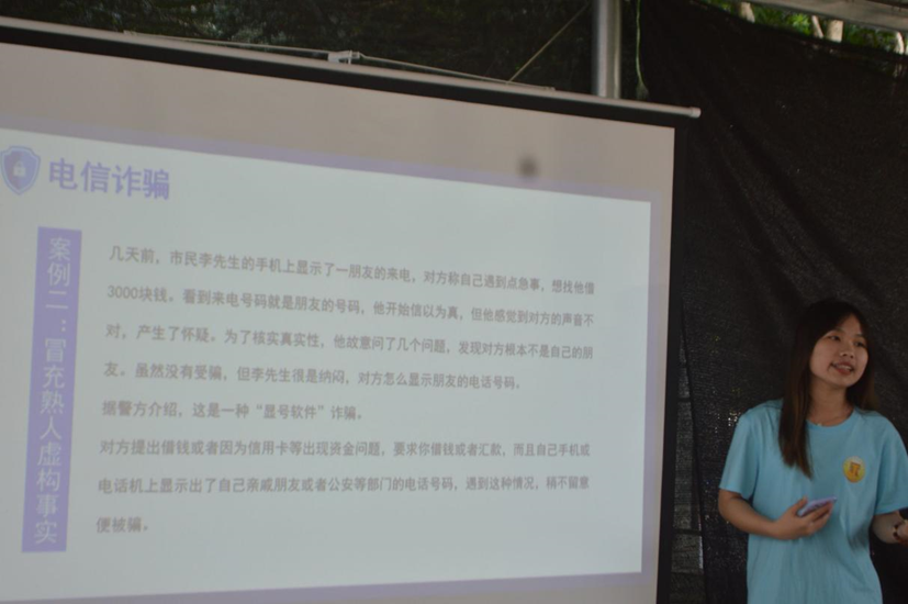 实践团根据问卷调查和实际走访暴露出的问题有针对性地开展了防诈骗知识宣讲。实践团通过播放防诈骗视频、普及诈骗手段、识别新型骗局等方面展开,从预防、识别、应对方面将防诈骗知识普及给广大人民群众。理论宣讲过后,实践团还设置了全方位地知识问答,检验和巩固本次防诈骗知识活动的普及效果。活动现场大家踊跃参与,积极响应,取得了良好效果。