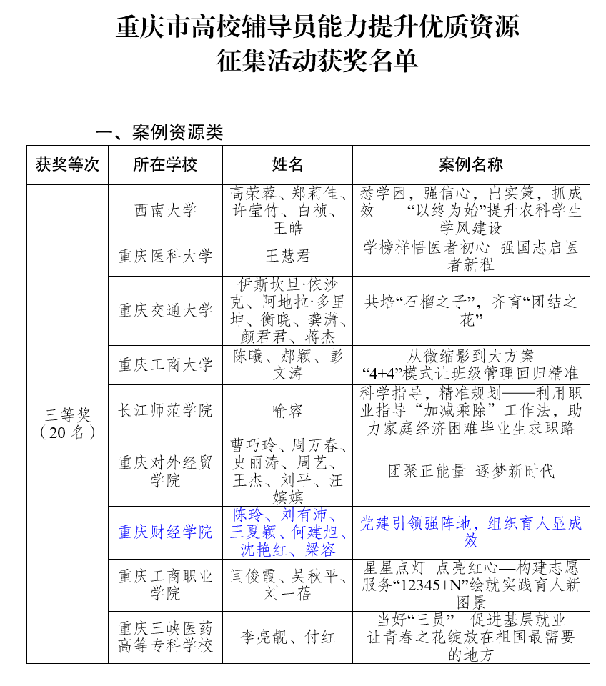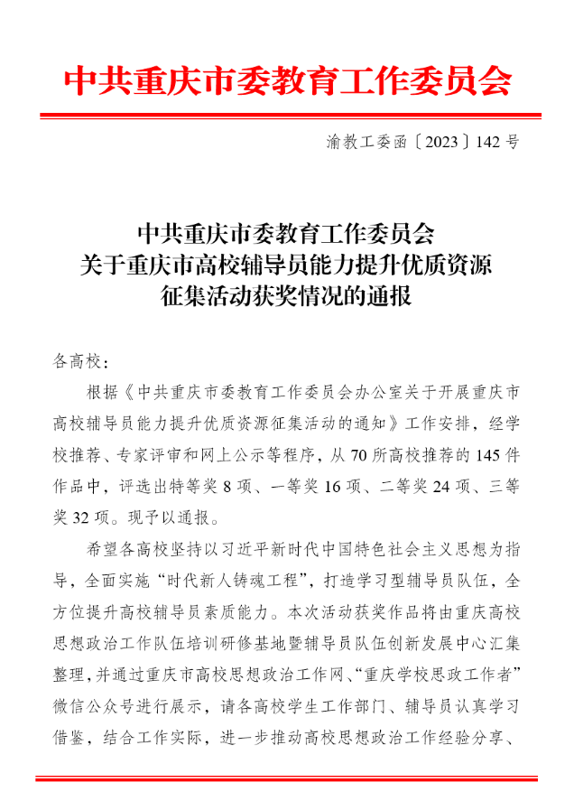 【喜报】我校辅导员团队在重庆市高校辅导员能力提升优质资源征集活动中获奖