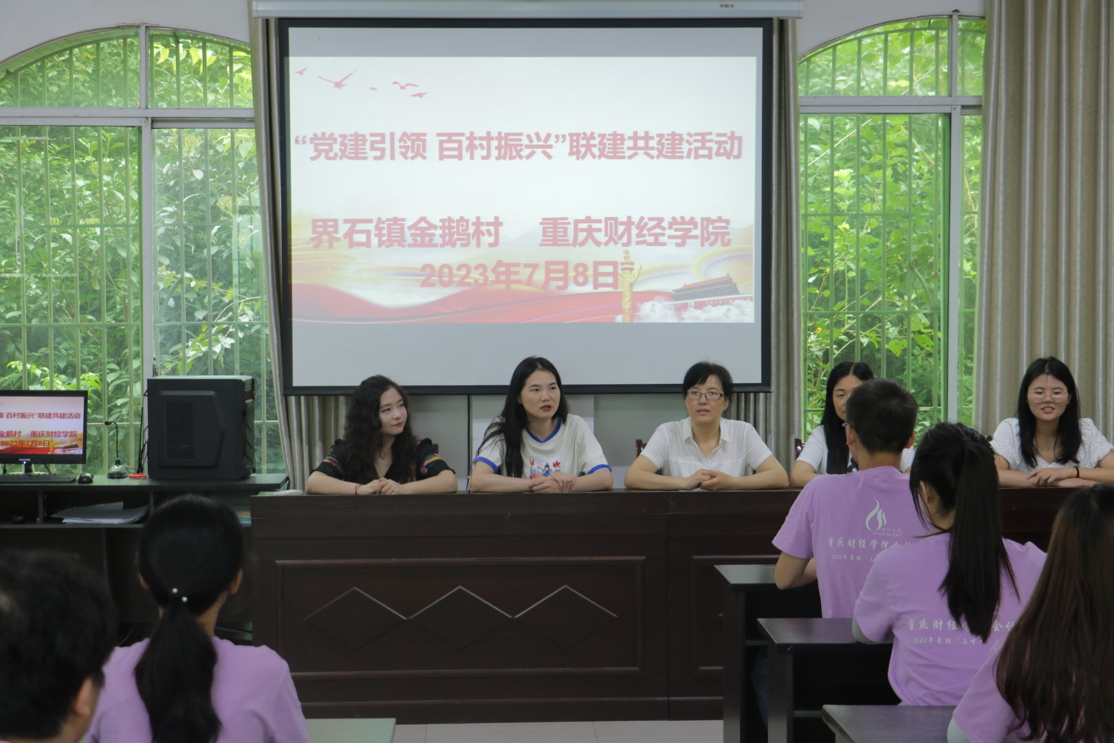 为深入贯彻学校“扎根巴南、融入巴南、服务巴南”的理念,助力乡村振兴,推动乡村产业、人才、文化、生态、文明全面发展。7月8日,我校会计学院2023年暑期“三下乡”社会实践团在会计学院团总支书记谭白冰、学生第一党支部书记阳圆、专职辅导员谢雨贝三位指导老师的带领下来到了界石镇金鹅村参加“党建引领,百村振兴”联建共建启动仪式,金鹅村乡村振兴指导员胡娟、党委副书记张莉出席了本次活动。